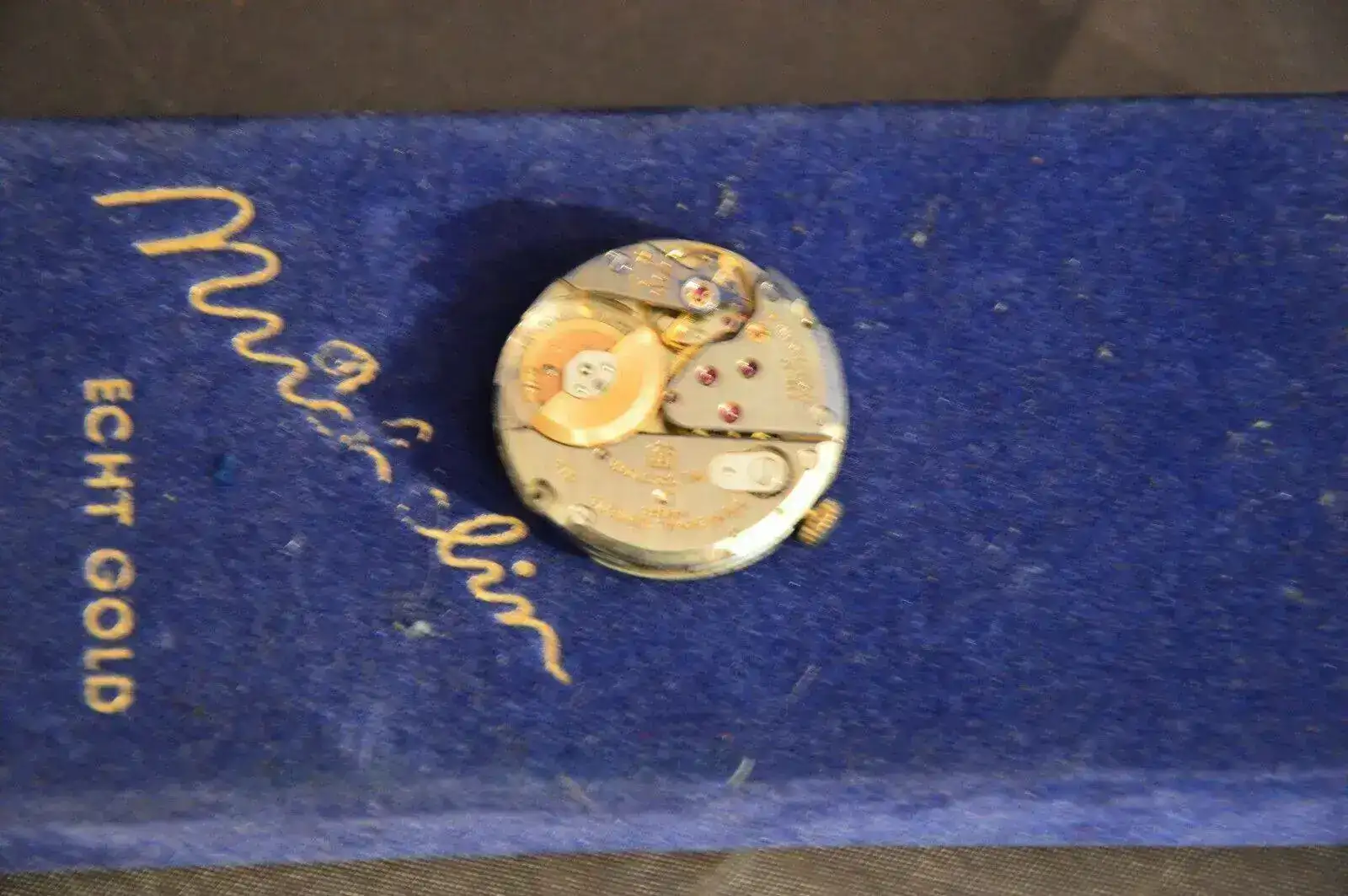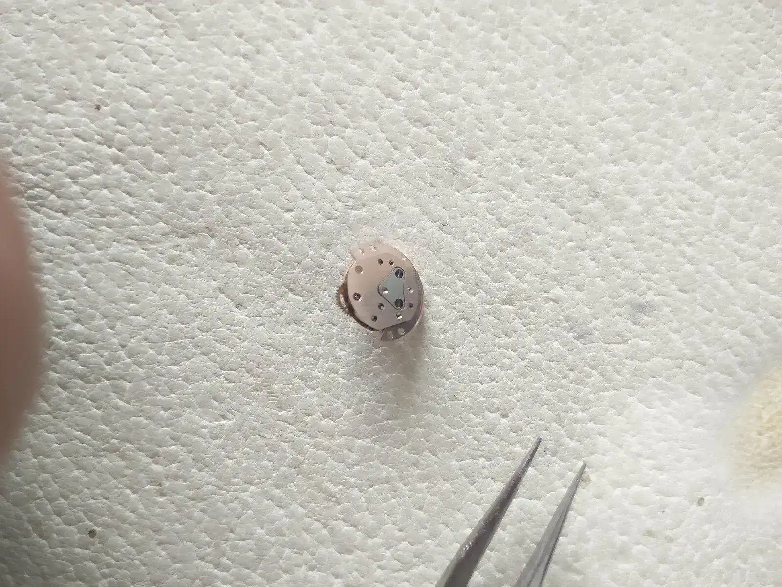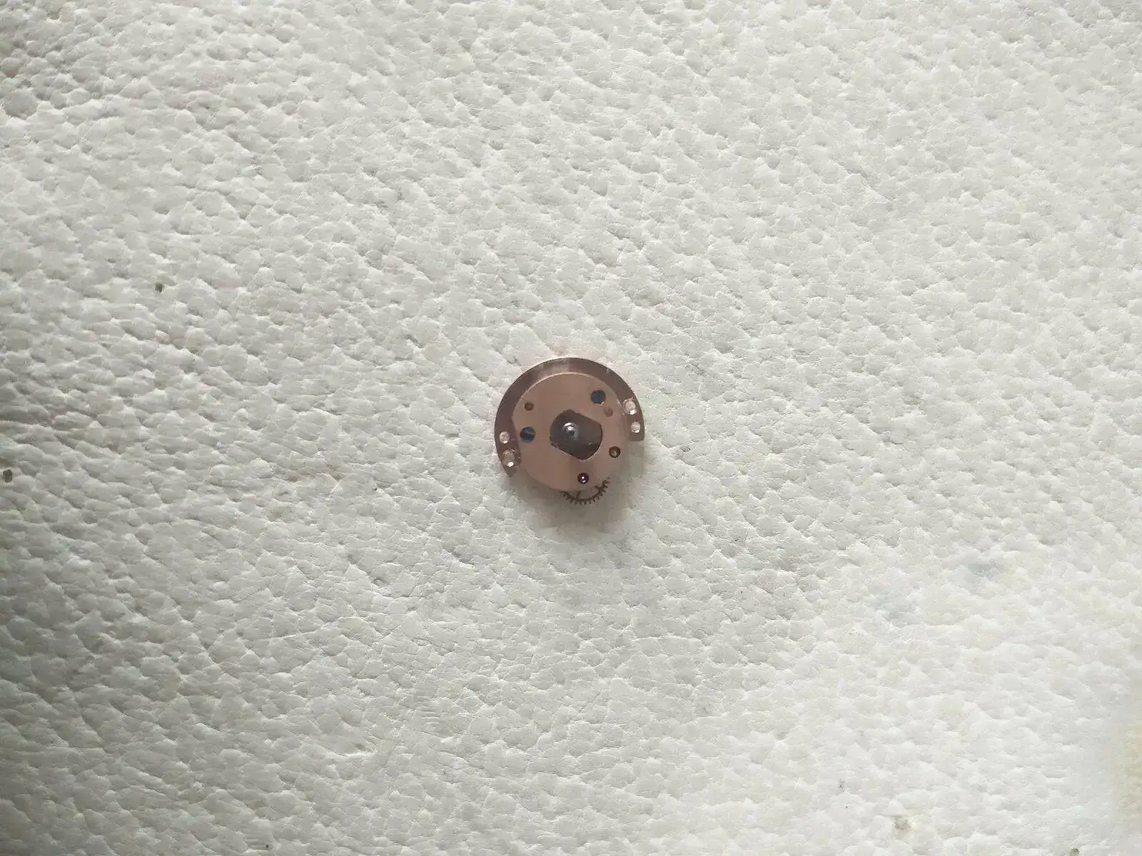 Un calibre 215 en magnifico estado, sin el eje volante roto UFFFF pero con el microrotor tocado, era algo que daba por descontado ya que es un mal endemico de estos relojes o se estropea el eje o se rompe uno de los 2 rubies que tiene la masa oscilante, en el nuestro, el rubi inferior se había roto y lo había intentado sustituir sin éxito por un casquillo de bronce, el caso es que un trozo del rubi se había metido entre la masa oscilante y la bata bloqueando el movimiento, fue sacarlo y el calibre intentó volver a la vida. Como los recambios para este calibre son muy caros, me daba mucho respeto meterle mano sin más por lo que se fue al cajón tras comprobar que no disponía de ningún rubi compatible con el que se había roto.