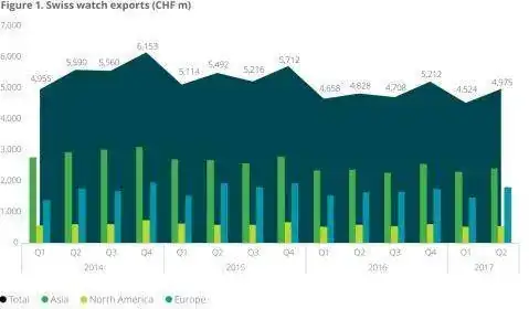 Se aprecia recuperación en los mercados en el 2017, las exportaciones durante el último trimestre del 2017 alcanzaron los 5 billones de francos suizos, mejorando los 4,8 del mismo periodo del 2016.