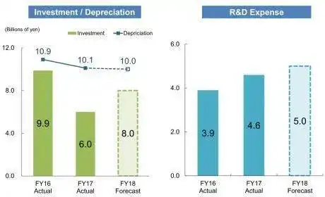 Aunque las inversiones descendieron en el 2016, siguieron manteniendo un esfuerzo en los gastos de innovación (R&D Expense), llegando a los 5 billones de yen en el 2018, unos 38 millones de euros.