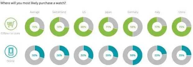 Muy curioso es el resultado a la pregunta sobre dónde comprar un reloj. En general la gente se informa online y luego va a comprar a la tienda física. Pero mirad Alemania