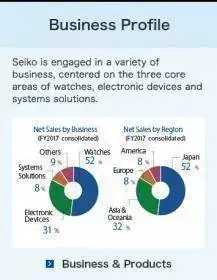 Seiko es un multinacional con tres grandes divisiones de negocios: relojes (relojes y movimientos), productos electrónicos (semiconductores, cristeles de cuarzo, impresoras térmicas, etc.) y soluciones de sistemas (desarrollos informáticos, software, sistemas de comunicación sin cables para coches, etc).