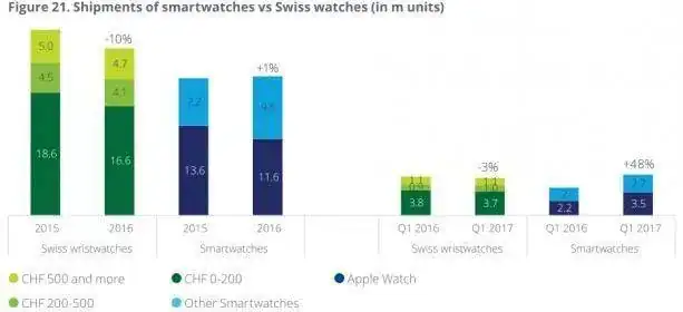Está habiendo un gran crecimiento del segmento de smartwatches, especialmente de la mano de Apple. EN 2016 de se vendieron 21.1 millones de smartwatches frente a los 25,4 millones de relojes suizos.