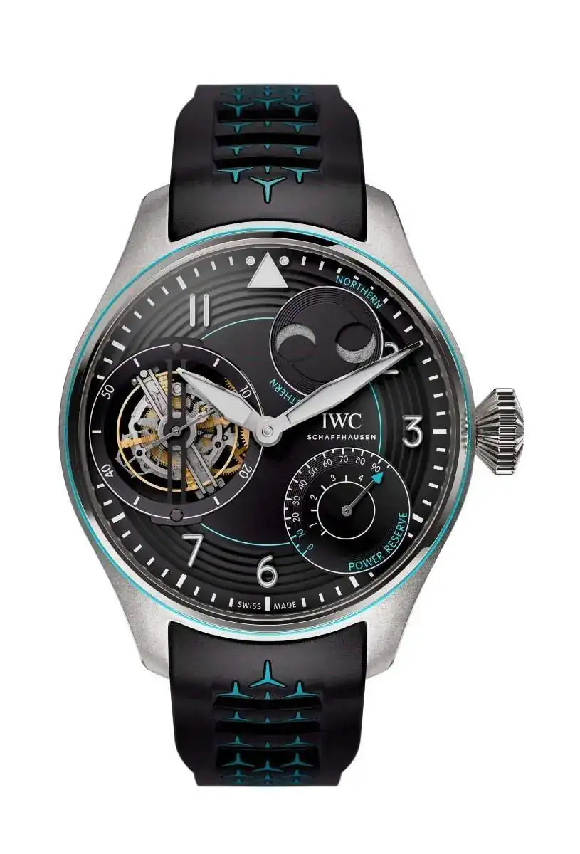 El Gran Reloj de Aviador Tourbillon de Fuerza Constante Edición "AMG ONE OWNERS" (Ref. 590502), cuya caja está fabricada en aluminuro de titanio, cuenta con el mecanismo de fuerza constante patentado por IWC. Esta complicación desvincula el escape del flujo directo de energía a través del tren de ruedas y transmite impulsos de energía completamente uniformes a la rueda de escape. Como resultado, incluso cuando el par del muelle real disminuye, el volante oscila prácticamente con la misma amplitud. En combinación con el tourbillon, que compensa las influencias negativas de la gravedad, esto garantiza una alta precisión. El calibre 94800 fabricado por IWC es de cuerda manual y almacena una reserva de marcha de 96 horas en su doble barrilete. El movimiento es visible a través del fondo de cristal de zafiro. El fondo de la caja es de Ceratanium®. Basado en una aleación especial de titanio, este material desarrollado por IWC es tan ligero y rígido como el titanio y, al mismo tiempo, casi tan duro y resistente a los arañazos como la cerámica.