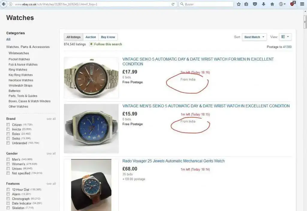 En ebay hay millones de relojes de bajo precio que vienen de vendedores afincados en india... pero yo he generalizado y puede que no haya sido específico