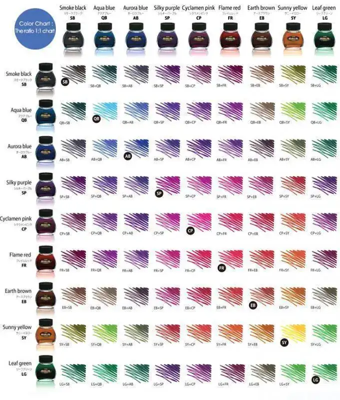 Otros fabricantes ofrecen sets de tintas para realizar mezclas. Un buen ejemplo es el kit de Platinum cuya carta se adjunta: