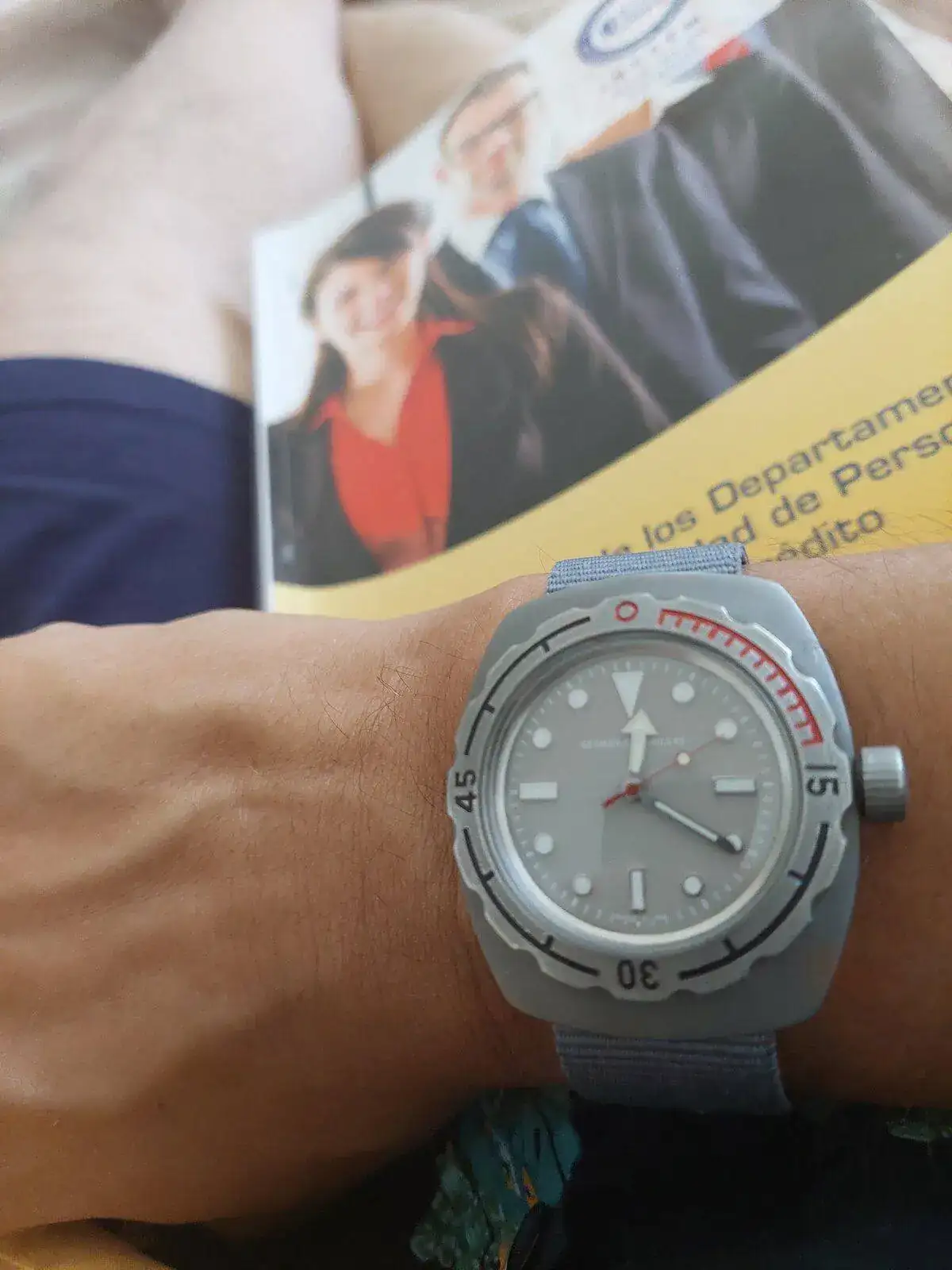 La primera foto es de concurso. Y el reloj precioso, me encanta la textura de la esfera y como queda con el bisel.