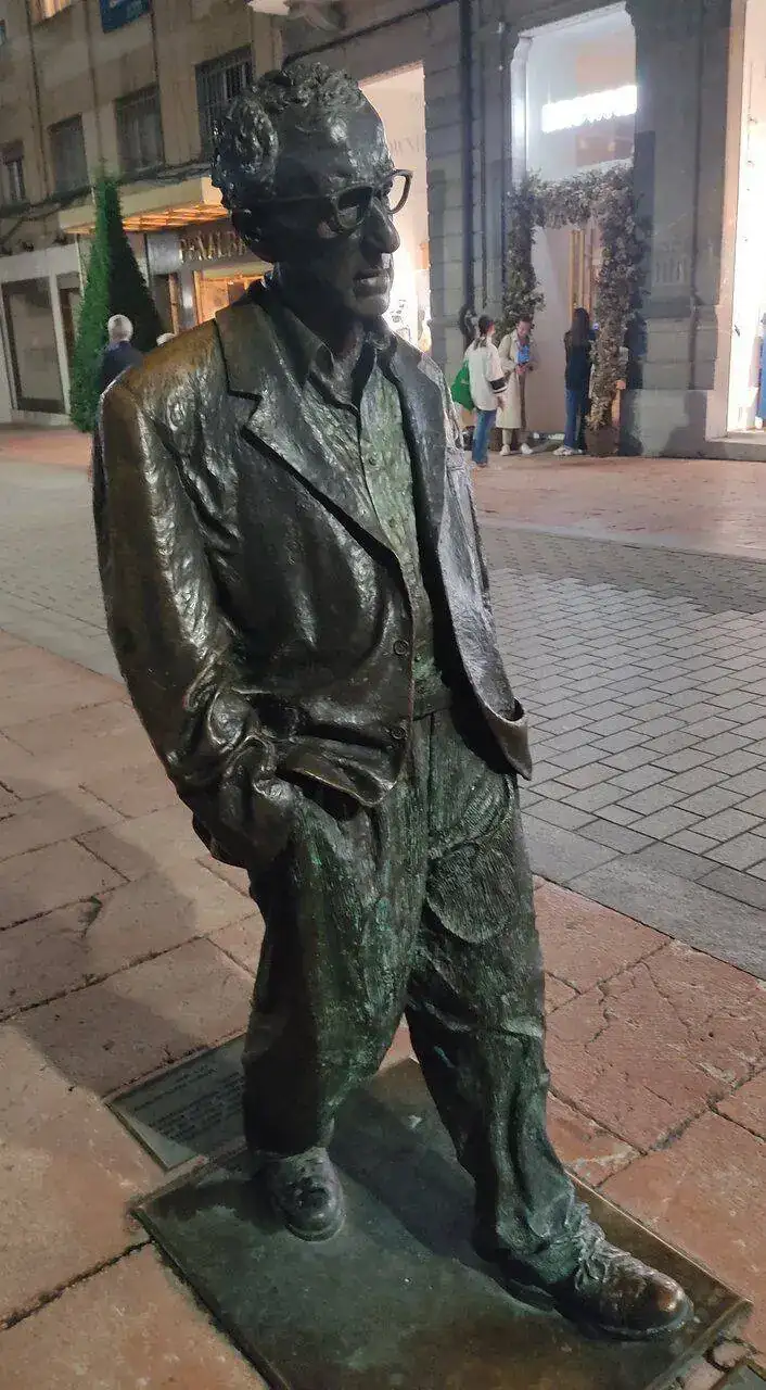 Woody Allen seguro que lleva reloj de bolsillo y por eso no se ve😂😂Como me gustan ese tipo de esculturas en el centro de las ciudades, cuando se de su existencia las busco. Hace poco, en Oviedo me topé con un ilustre cineasta.