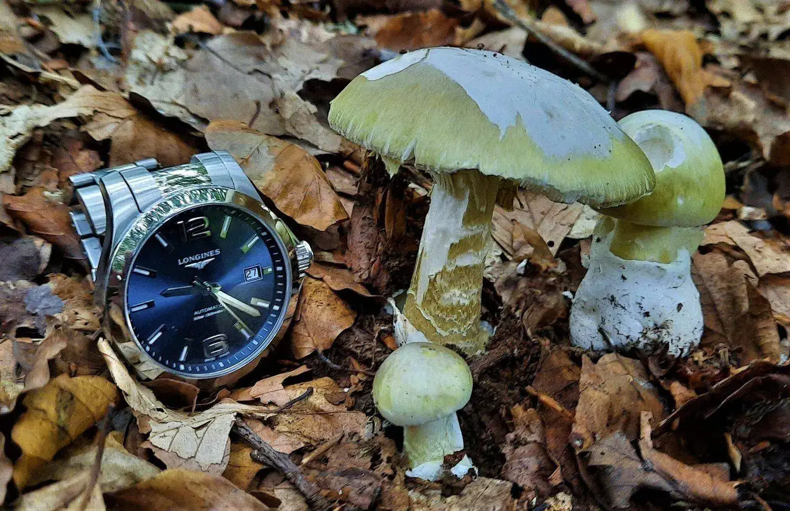 Que pasada se foto y que bonito es ese Conquest.Miércoles. Longines y Amanita Phalloides (Oronja verde), este año brota de forma abundante.