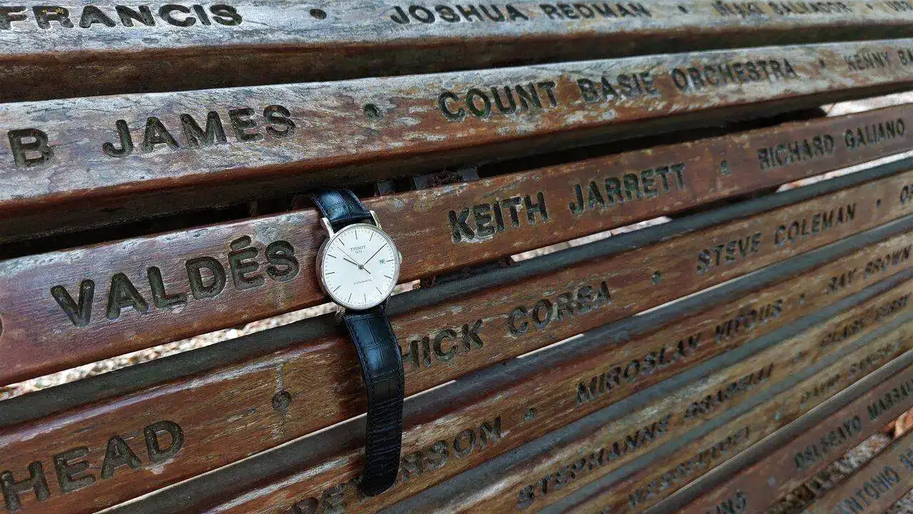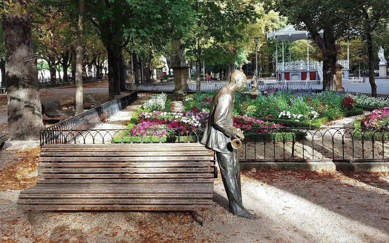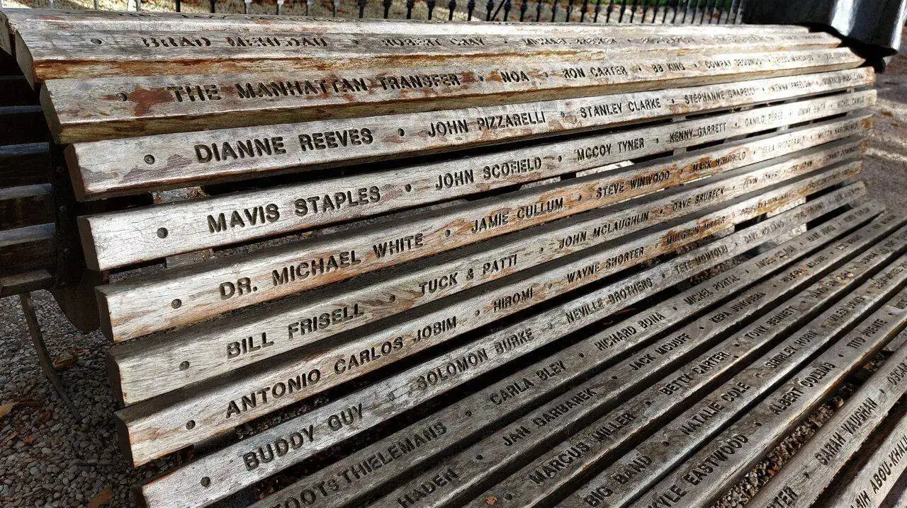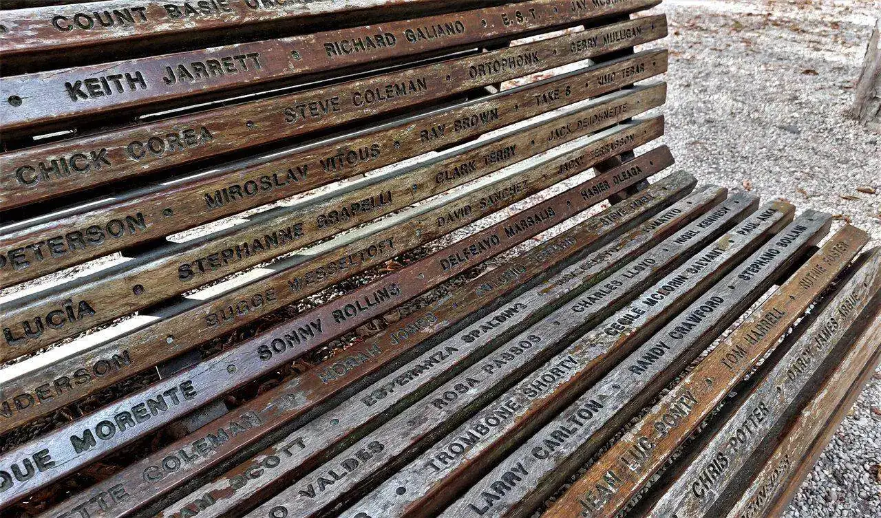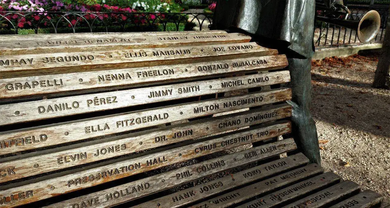 En uno de los parques donde vivo, el más antiguo y conocido, se encuentra un sencillo banco de madera instalado en el año 2006 como conmemoración en su momento del 30 aniversario de la primera edición de nuestro festival anual de Jazz, perfectamente custodiado por una estatua en bronce del mítico músico de Nueva Orleans Wynton Marsalis, muy ligado al evento y a esta ciudad.