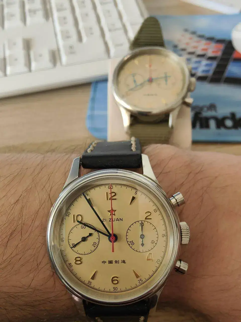 Seagull 1963 de 38mm y de fondo el de 40mm. No sé con cuál quedarme de los dos, pero debo vender uno... 😅