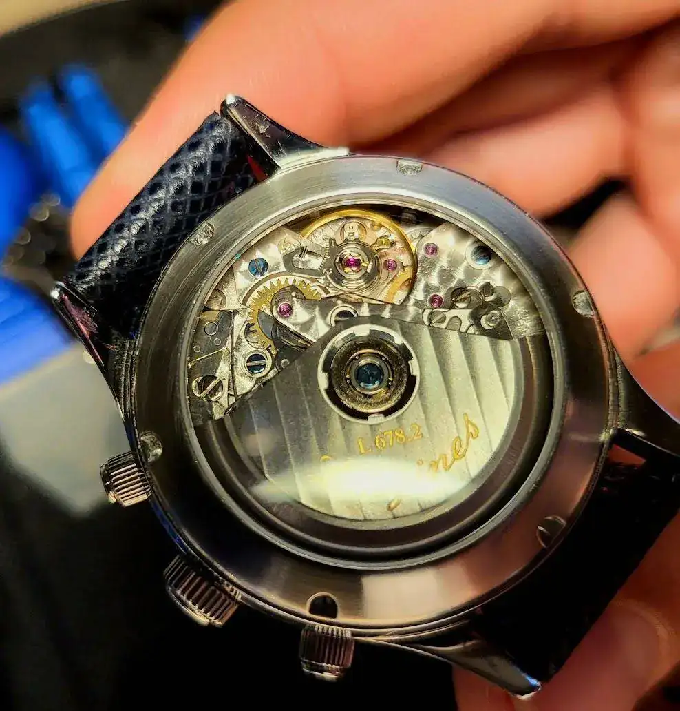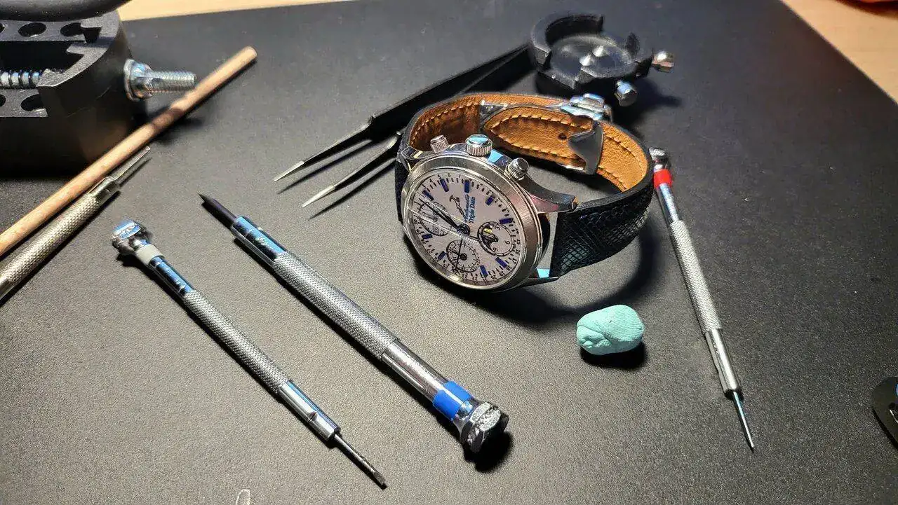 Y magnífico el conjunto fotográfico.Hoy a primera hora salgo de viaje y he puesto aquí al amigo a punto, que me lo quería llevar. Recolocar un par de índices índices que no quedaron planos cuando lo monté, ajustar un pelo las agujas y ponerle al movimiento los tornillitos azules TO WAPOHS que tenía en la recámara desde hacía meses y meses.