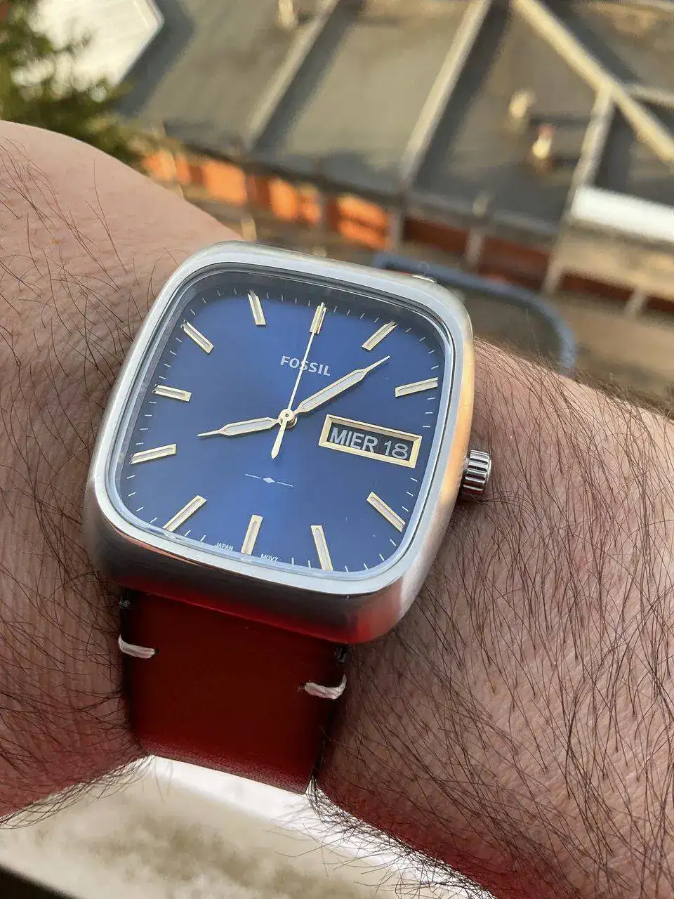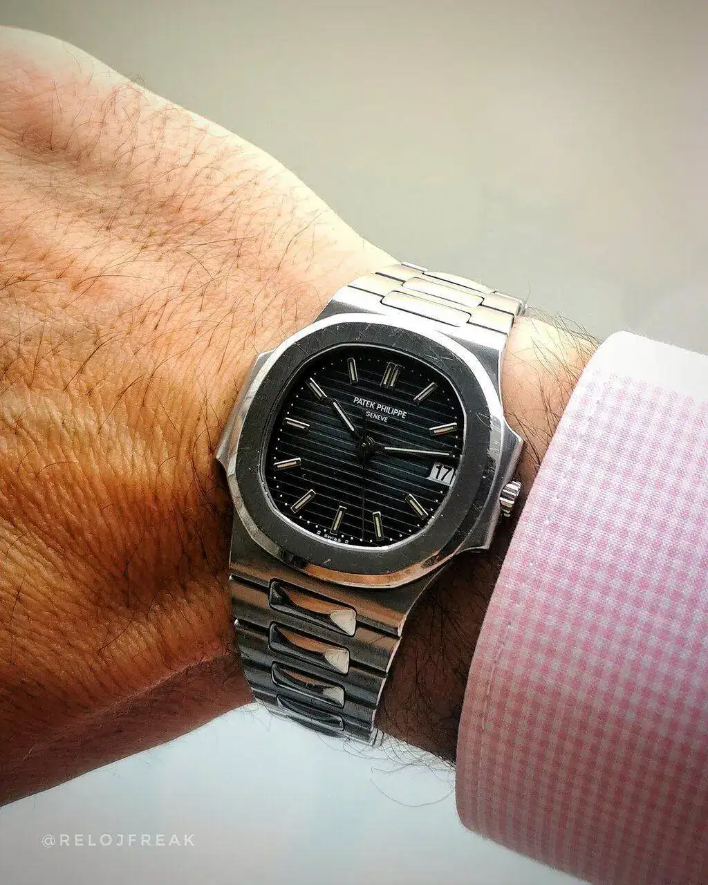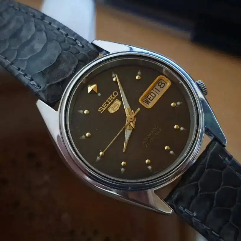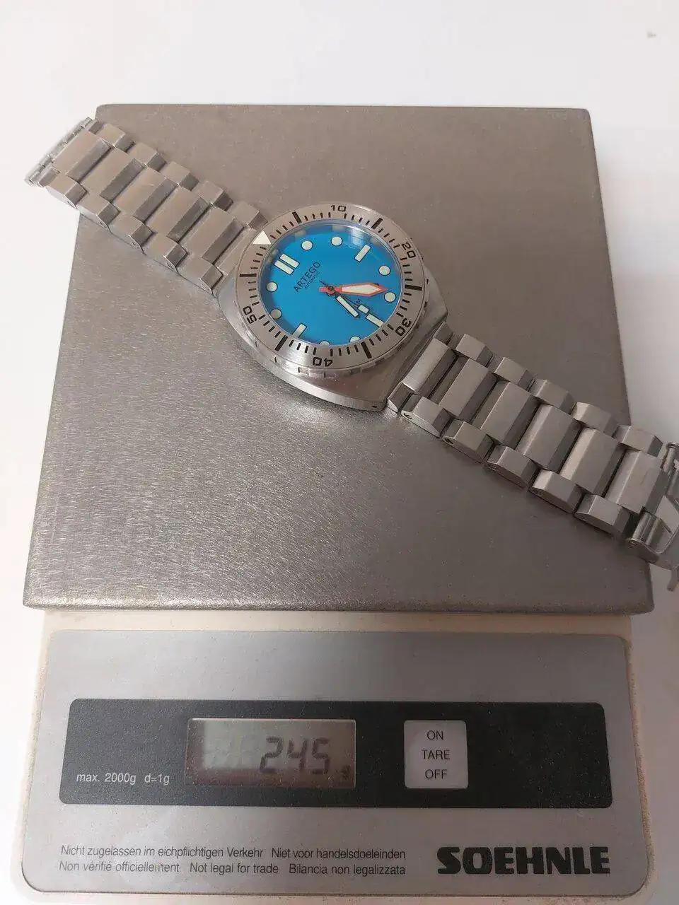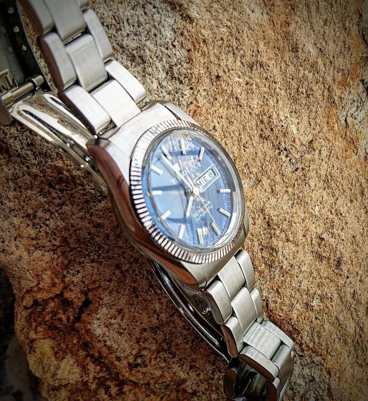 con esa caja setentera sin asas trabajada en varios acabados y con corona embutida,esa esfera azul electrica con los indices dorados,el aun mas raro calendario day date en ingles y …español!,esas agujas y ese pedazo de correa que quita el hipo por grosor,color e increible confort