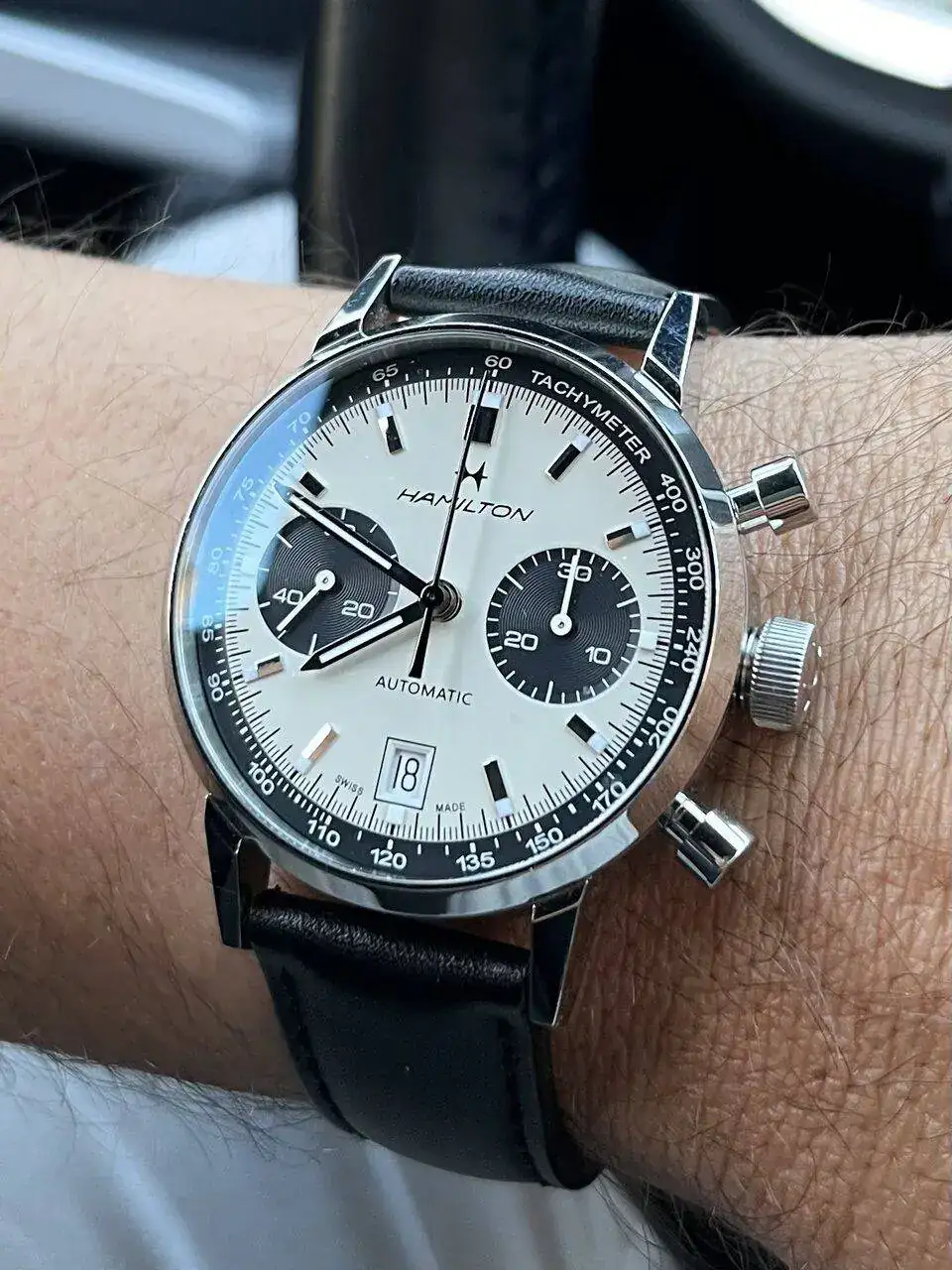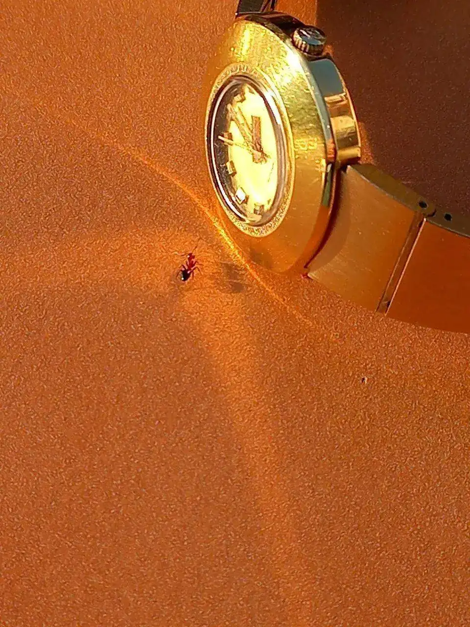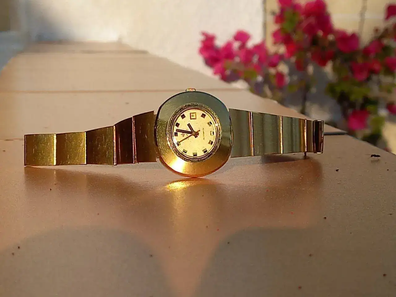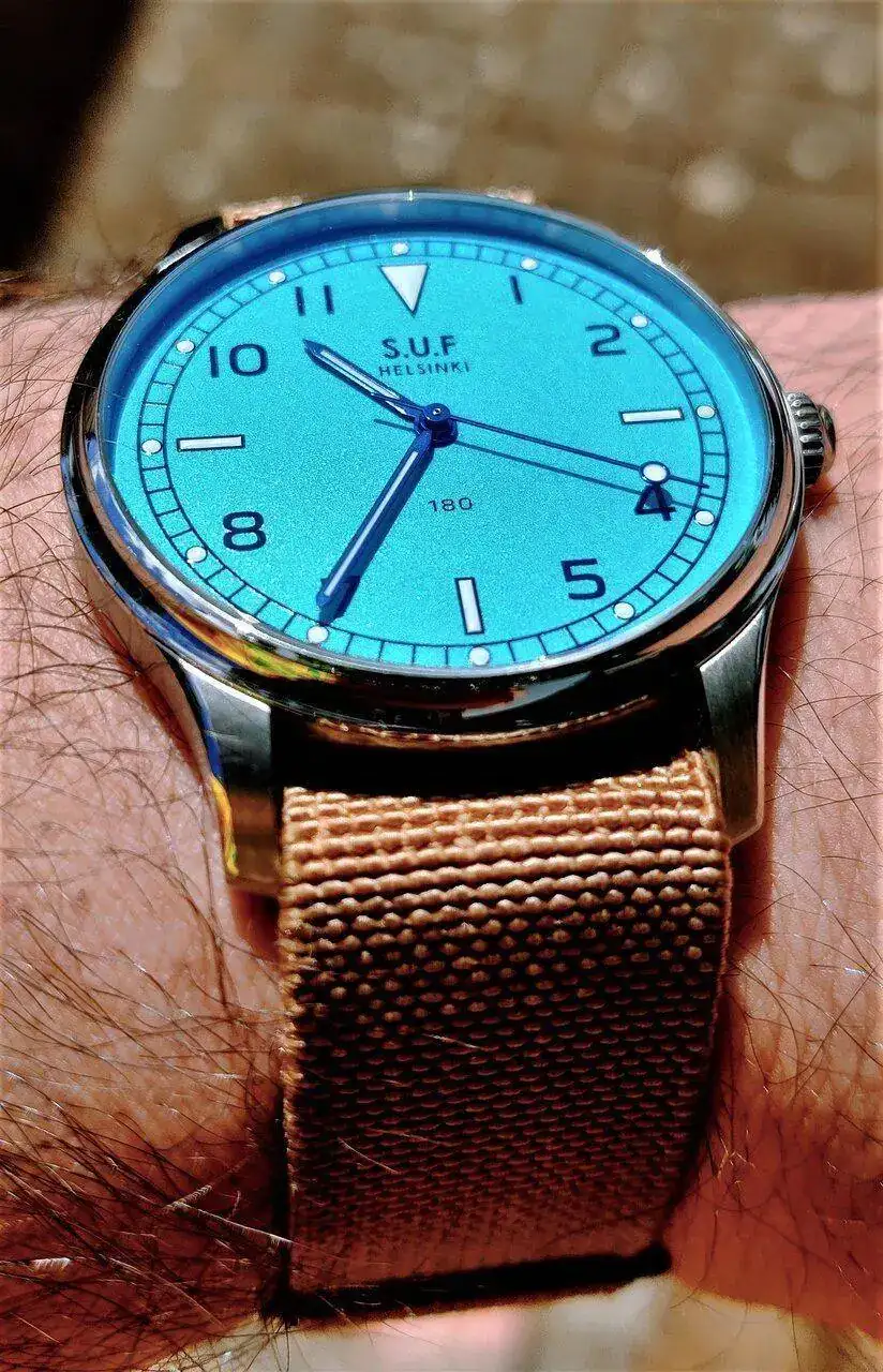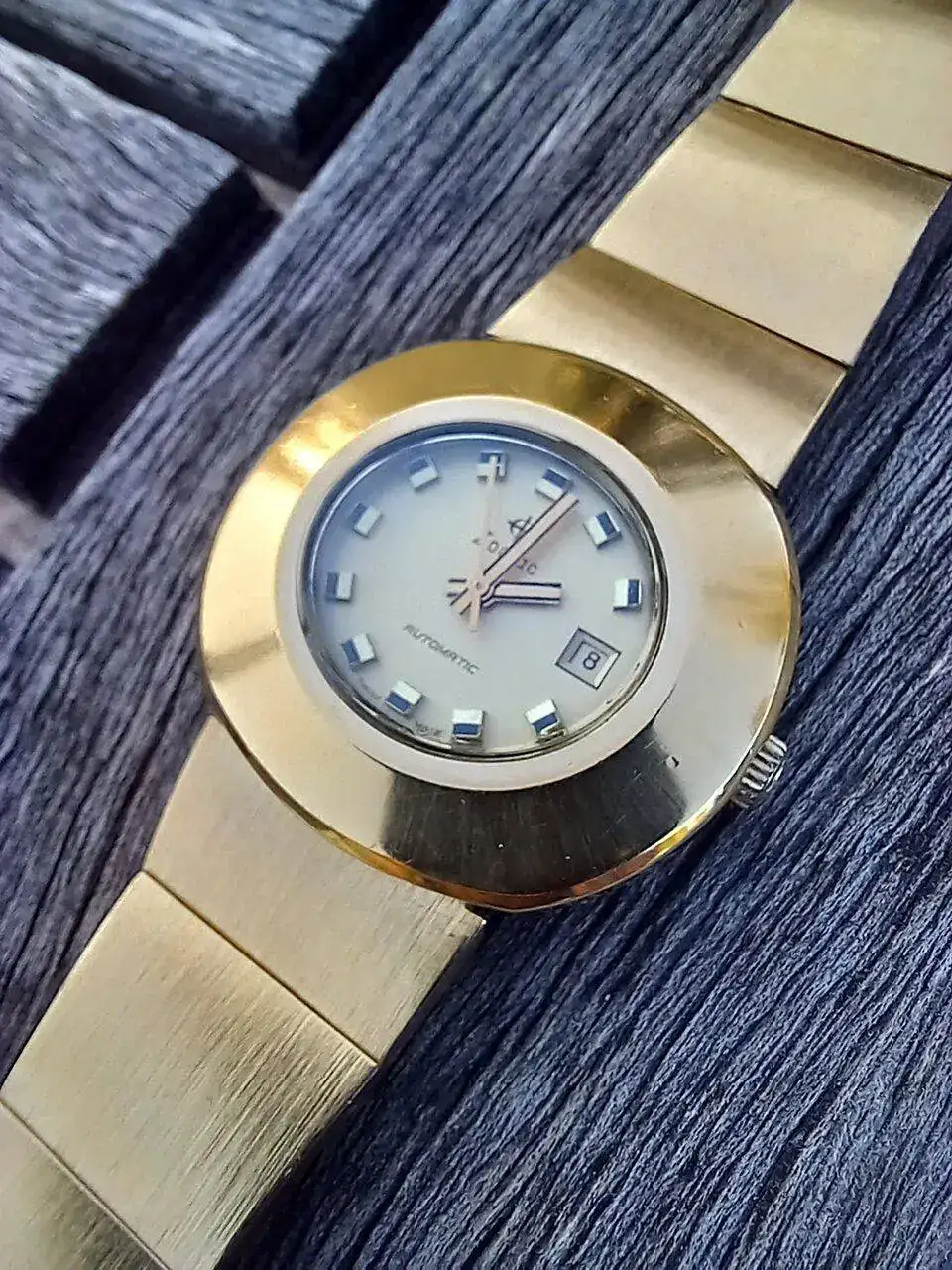 con esa caja setentera sin asas trabajada en varios acabados y con corona embutida,esa esfera azul electrica con los indices dorados,el aun mas raro calendario day date en ingles y …español!,esas agujas y ese pedazo de correa que quita el hipo por grosor,color e increible confort