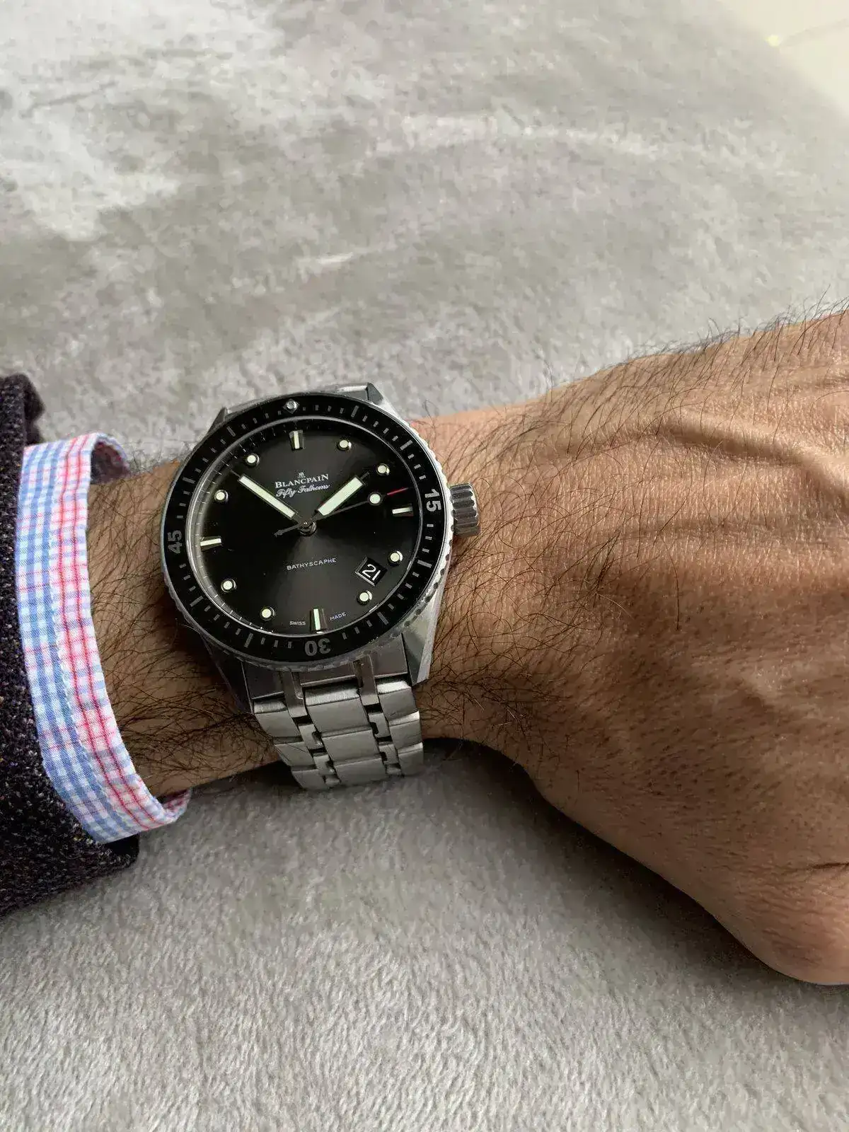 El caso es que no te imaginas la que me organizaron para ajustarlo a mi muñeca. Me lo consiguieron los de Chocrón que se dieron cuenta que sorprendentemente no podían quitar en su atelier los eslabones. Llamaron a la boutique oficial Blancpain en la calle Serrano y dijeron que no sólo no tenían esa herramienta, sino que dudaban mucho que ese brazalete existiera o que fuera de Blancpain (estaba en su web... otros que no debieron ir a clase ese día). Los de Chocrón alucinaban con la respuesta (y yo más porque si no fuera porque lo pedí yo después de verlo en la web hubiera pensado era una estafa). Llamaron al Corte Inglés que tenía otra boutique oficial y les dijeron que sí que tenían todo tipo de herramientas (?), que menuda tontería les estaban preguntando. Todo contento me fui para allá a que me lo ajustaran, y al verlo me dijeron que no sabían ni que eso existiera (Bathyscaphe con brazalete: insisto que yo lo pedí porque había ese modelo en su propia web). Otros que tampoco fueron a clase. Y cuando intentaron mover los tornillos vieron que ninguna de sus herramientas podía. Al final, por suerte la central técnica de Swatch está en Madrid (en Alcobendas), les consultaron y me dijeron que me tomaban medidas de la muñeca y que lo mandaban allí que seguro tenían la dichosa herramienta y que en una semana volviera (a la boutique del CI) a recogerlo. Yo compuesto y sin reloj (ya pagado...).