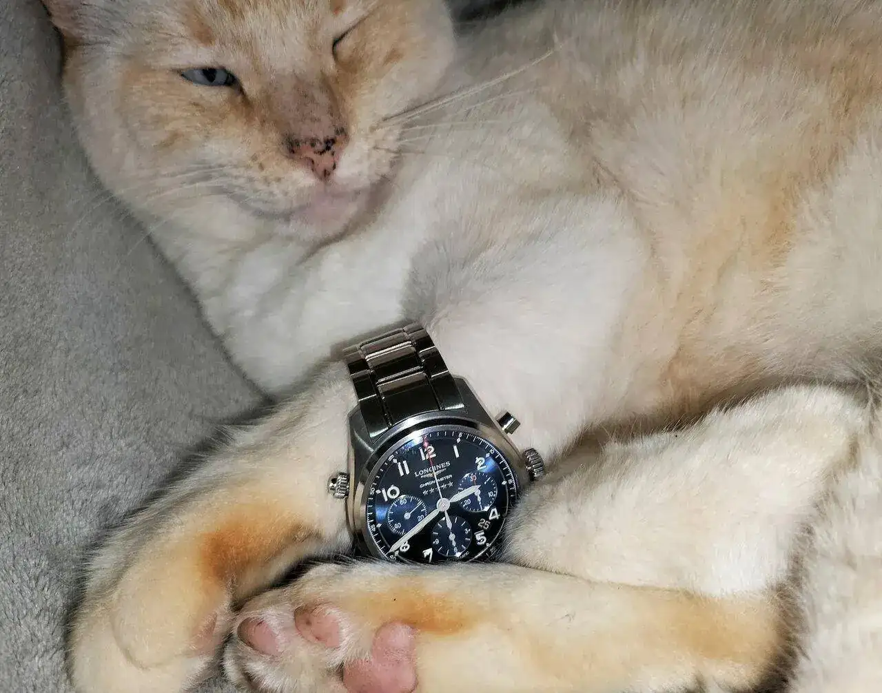 Los gatos son muy listos. A éste el Longines le queda de maravilla.Con el frío que hace hoy fuera, al venir de mi muñeca calentito, si se lo dejo duerme con él.
