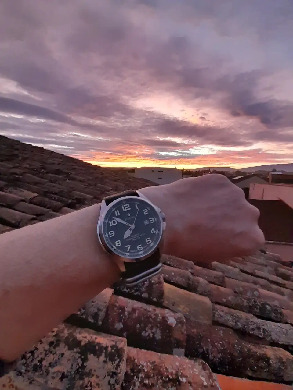 Precioso reloj, preciosa puesta de sol y precioso tejado de los antiguos. Buen día!