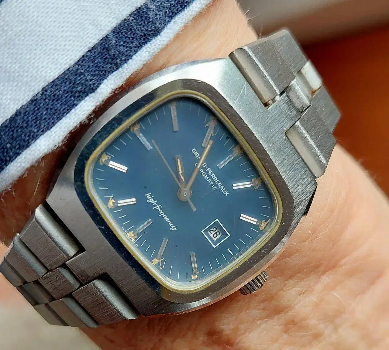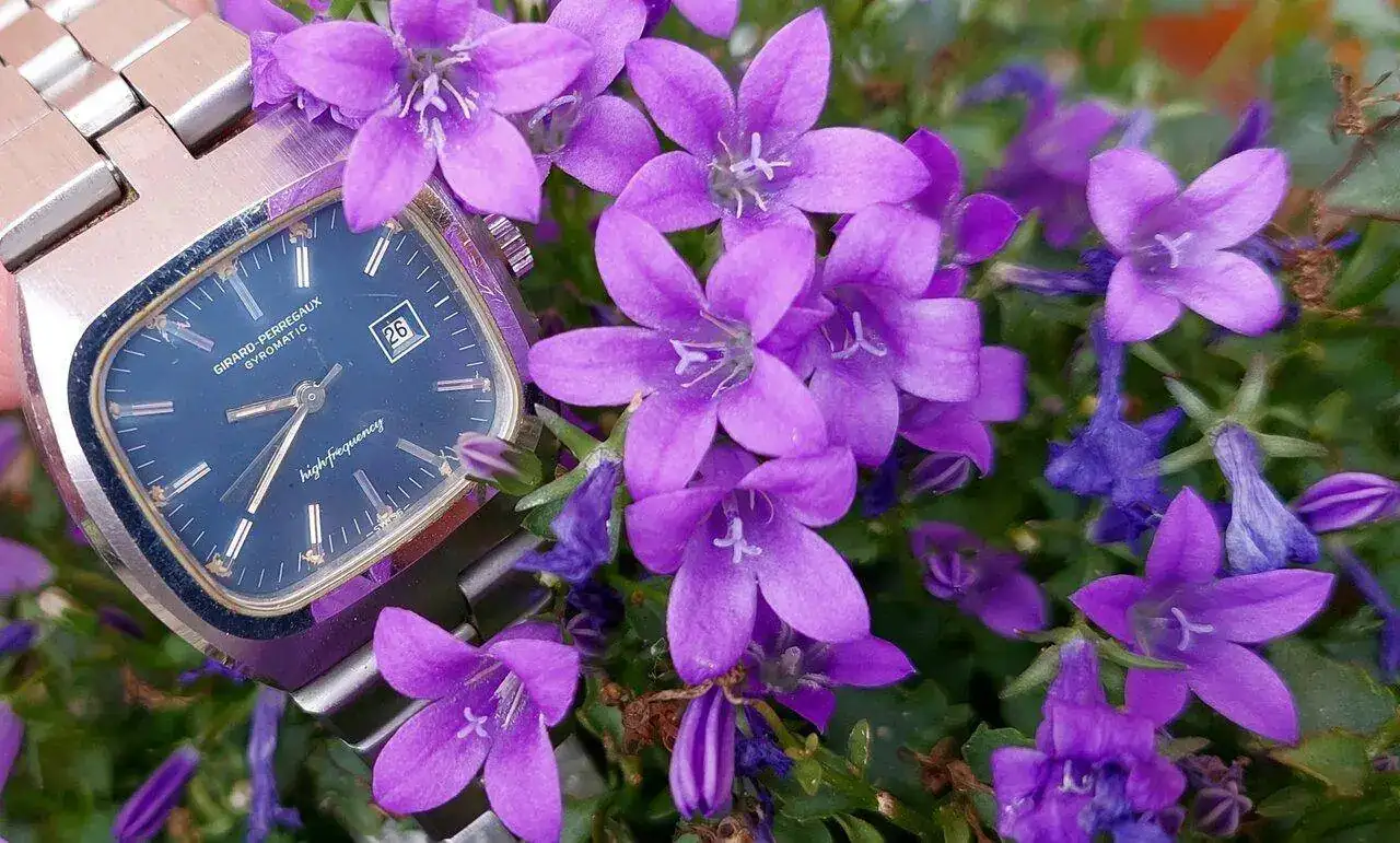 Otro relojazo vintage. Esas florecitas moradas lo realzan. Un Girard...