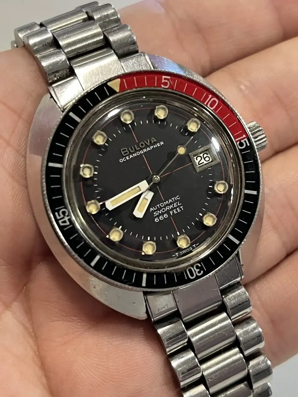 Maravilloso trabajo….enhorabuena 👏🏼👏🏼👏🏼👏🏼😉Restaurado en mayo de 2024. Mi primer proyecto exitoso. Servicio, pulido y reemplazo de cristal por zafiro de cúpula sencilla (es imposible encontrar cristales genuinos NOS para estos modelos). Creo que la silicona naranja da un toque de frescura y originalidad en verano. Piel marrón oscura para el invierno.