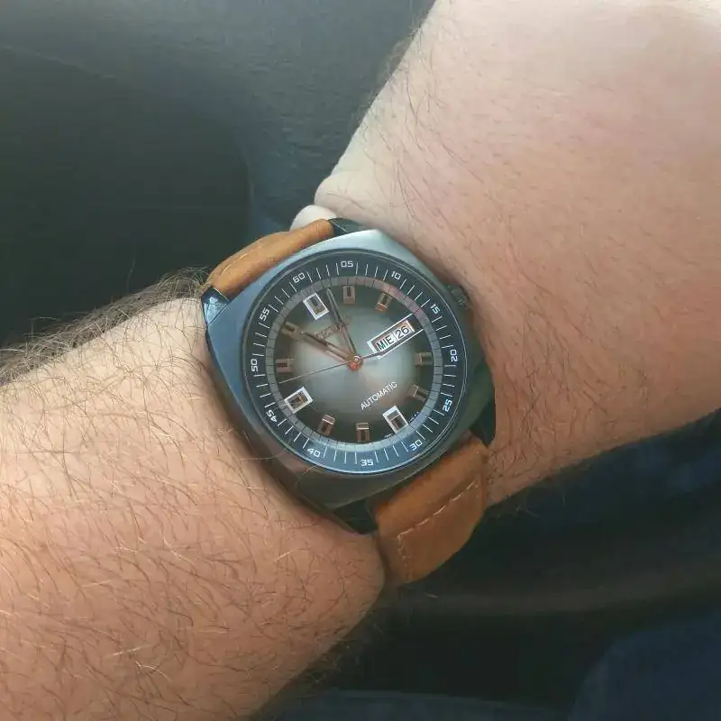 Hoy el pequeño tuna can con pantalones nuevos. Rally de piel de Hirsh con cosido a mano en hilo blanco y sin el feo vello que nos caracteriza y afea considerablemente la estética de la pieza. Como siempre digo,los relojes se lucen más en verano,pero quedan mejor en invierno. Feliz dia!