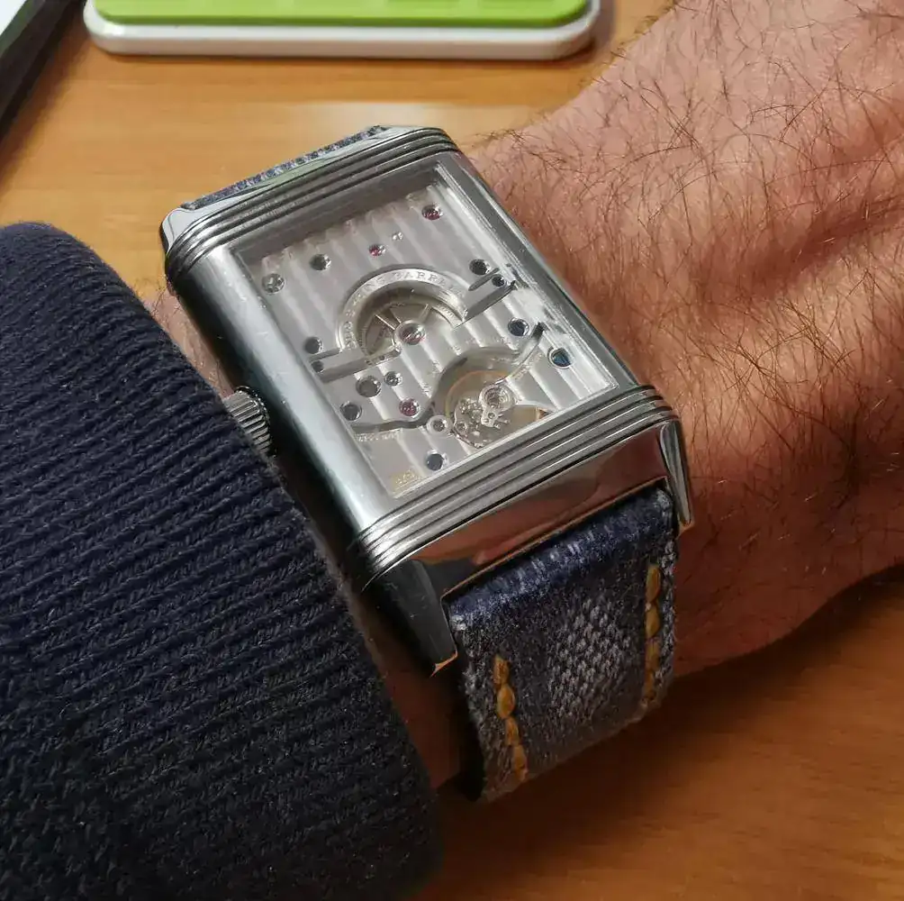 Lo mejor esta dentro y casi no cabe, el movimiento calibre 586 con nada menos de 34mm. De mi saber es el movimiento mas grande para un reloj de pulsera con tres manecillas, que permite un volante grande que garantizar una marcha muy buena. En este caso lleva espiral Breguet, 17 rubis en chatons, Cymaflex antishock y Cotes de Geneve. Lo que puedo probar hasta hoy, la marcha esta espectacular en todas las posiciones.