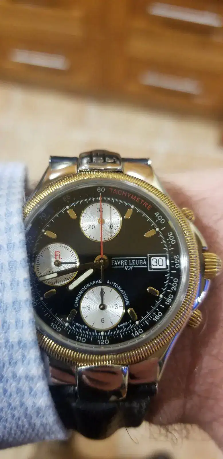 Pues esa estética Breitling noventera tiene un punto y FL siempre ha hecho estupendos relojes ¡A mí me gusta!Buenos días, hoy uno que sale muy poco. Favre Leuba que me regaló mi mujer hace 26 años.