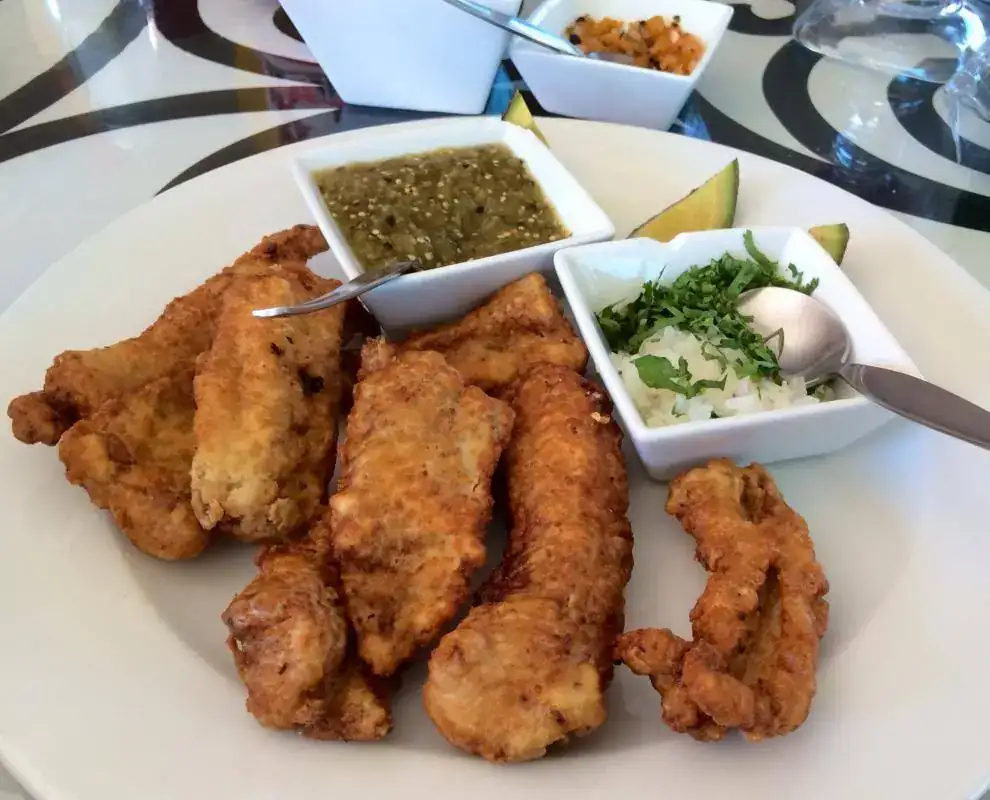 Unos chicharrones de pescado con salsa de chile.
