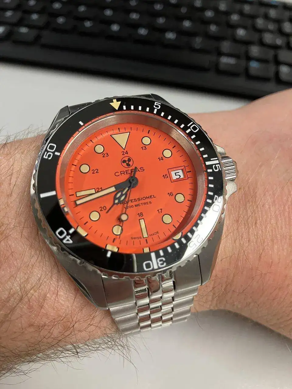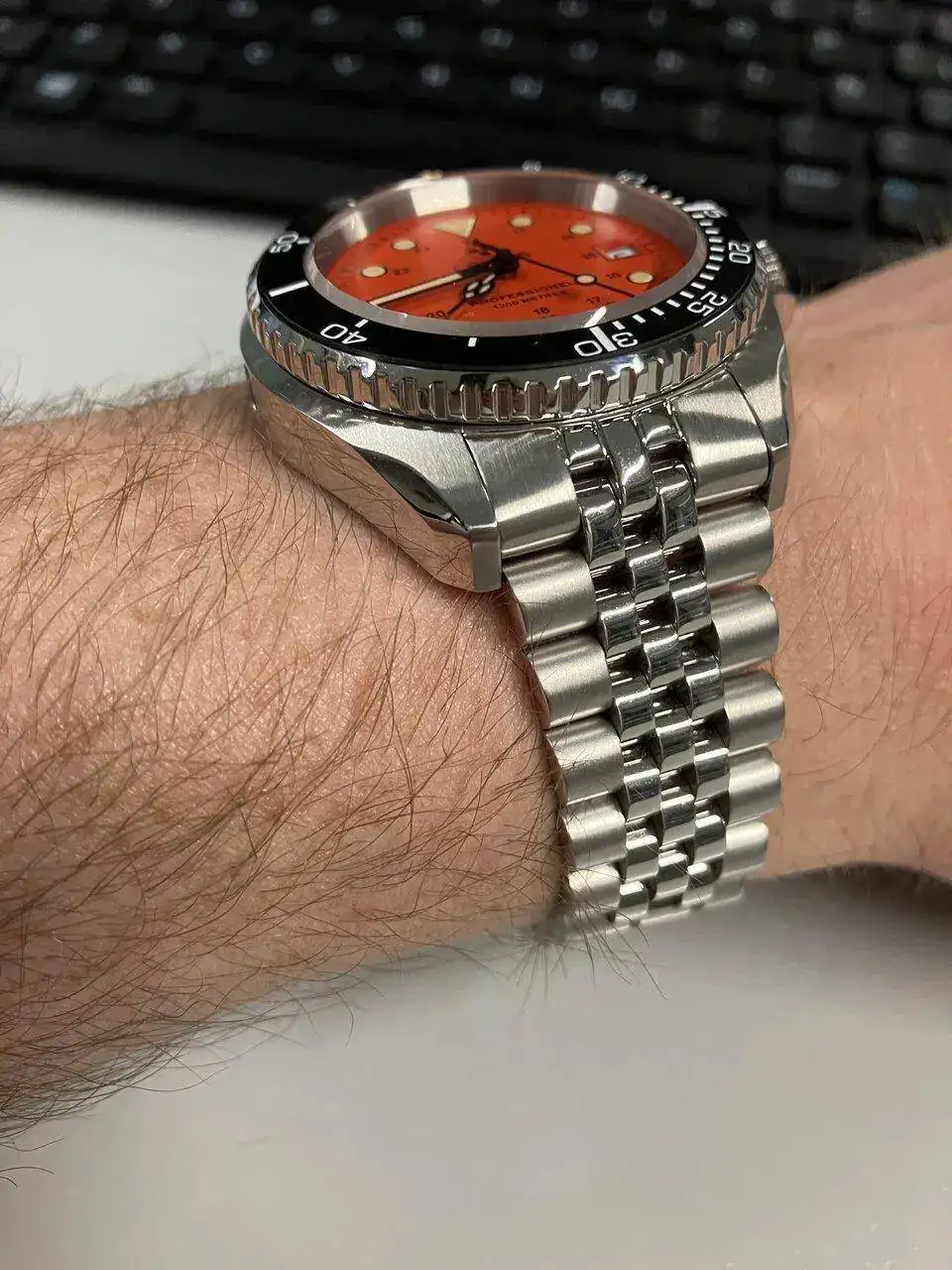 Me gusta un montón este reloj, el bisel sobre todo :drool: Mi MDD lo tiene en plata, pero me queda enoooorme ::cry::