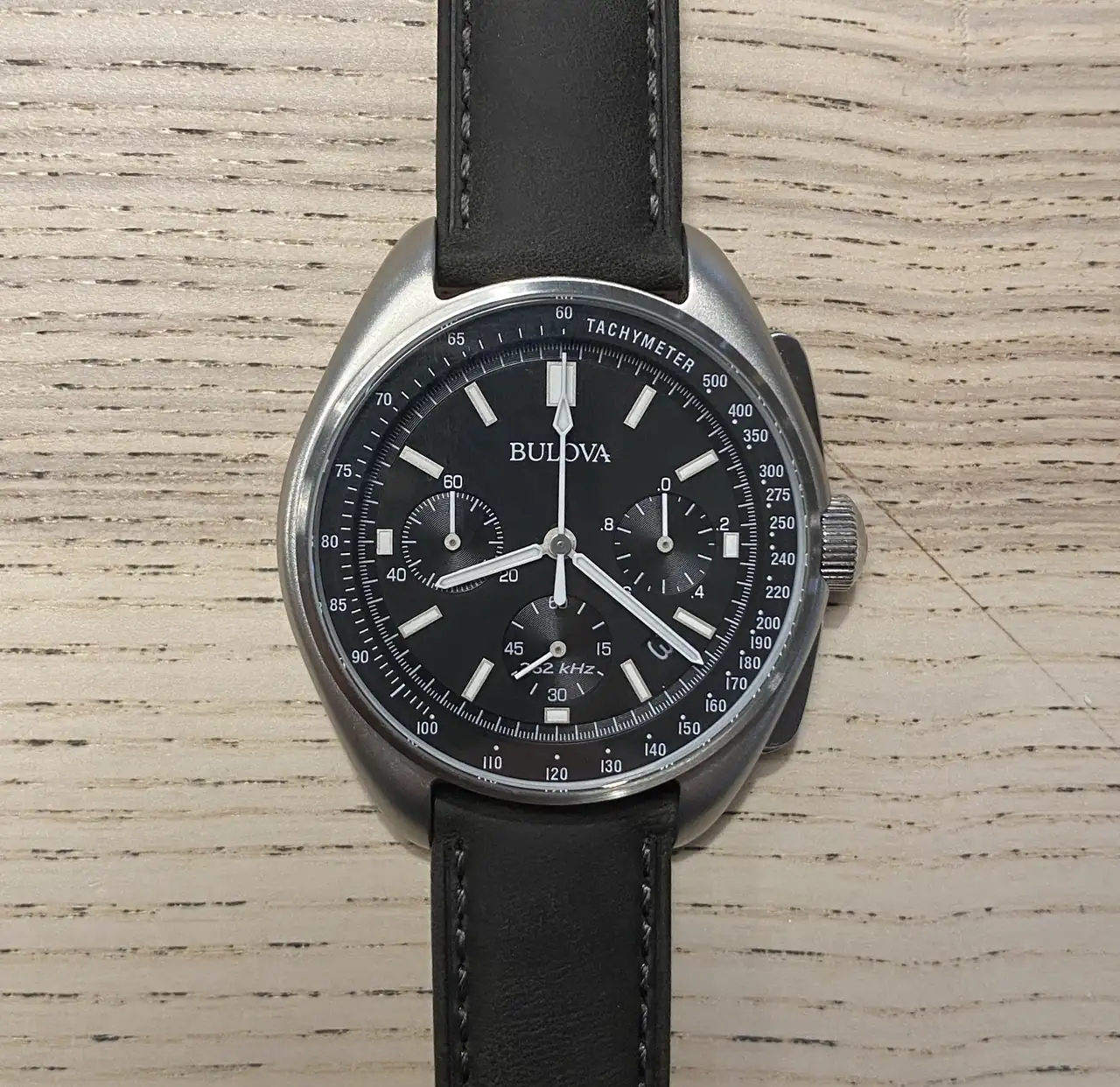 Yo estoy probando unos pantalones recién llegados (detalle de cumpleaños atrasado) para el Bulova Lunar Pilot. Un gris antracita bastante oscuro que pienso que no le sienta nada mal!