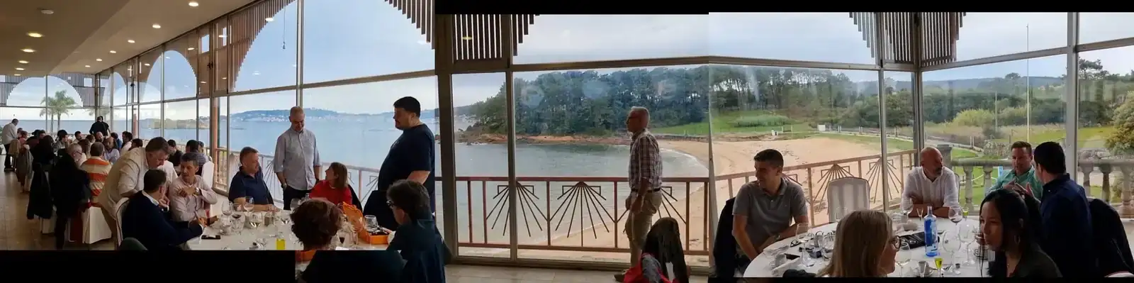 Lo siguiente fue ir al hotel y previamente a la comida unos cuantos nos tomamos otro vinillo en su cafetería, donde el ambiente ya era totalmente de quedada con relojes surcando unas muñecas y otras sin parar mientras las conversaciones se tornaban en cumplidos a X reloj de X compañero, risas y buen rollo garantizado, vamos, la "creme de la creme" todo este ambiente generado entre compañer@s. Además, como no podía ser de otra manera, la escena tenía este precioso y evocador escenario como fondo: