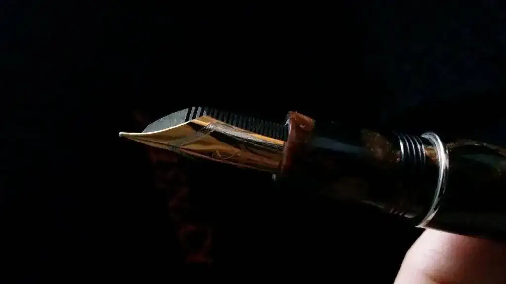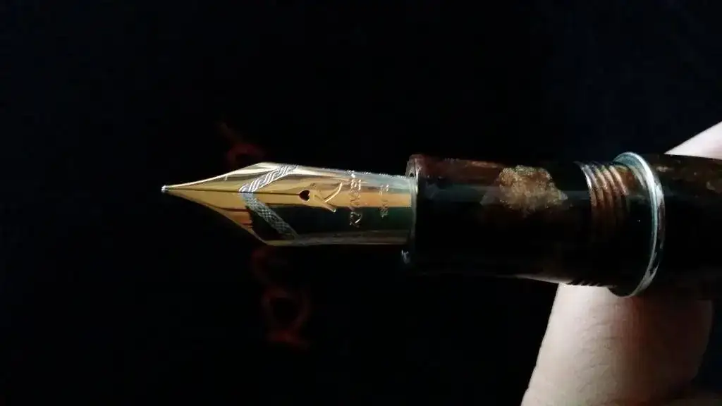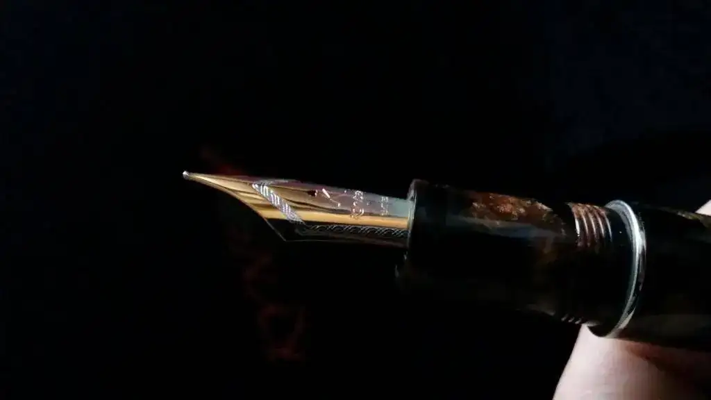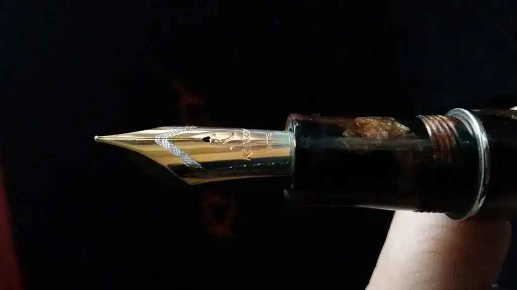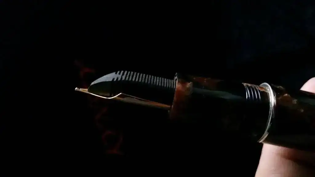 Tengo el temor (o mejor dicho la sospecha) de que Delta haya tenido algo, mucho, o todo que ver con esta pluma, ya que el celuloide, apostaría la vida, a que es exactamente el mismo que el utilizado por Delta en su Enrico Caruso y en algún modelo más. El alimentador, de ebonita, efectivamente también se parece sospechosamente a los alimentadores de ebonita de todas las Delta que poseo. Y el plumín, hasta con el orificio de respiración en forma de corazón, tiene el mismo diseño que los plumines Delta.