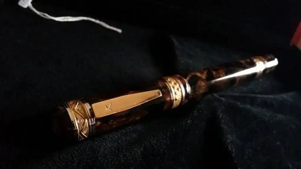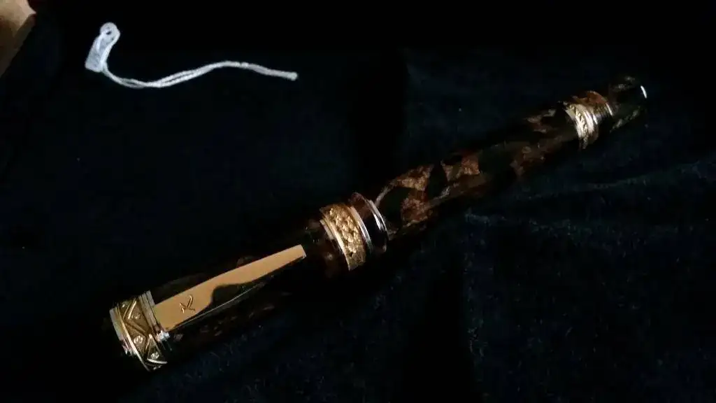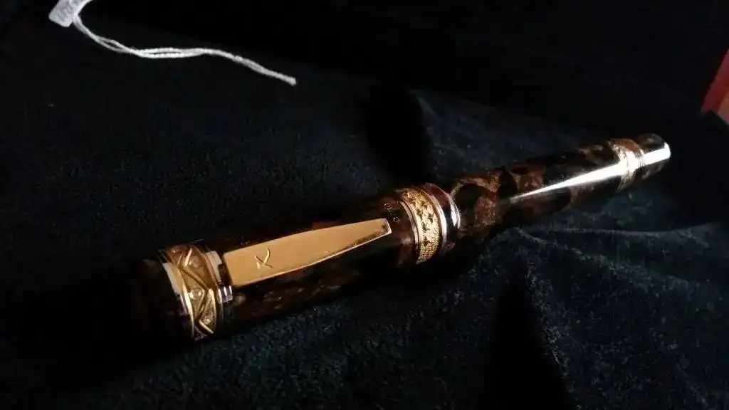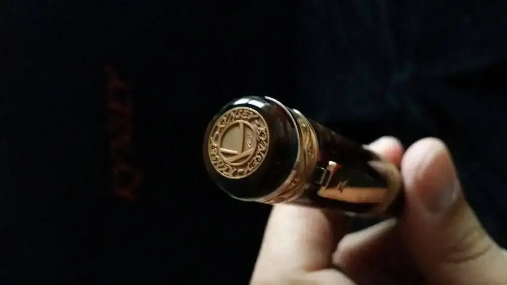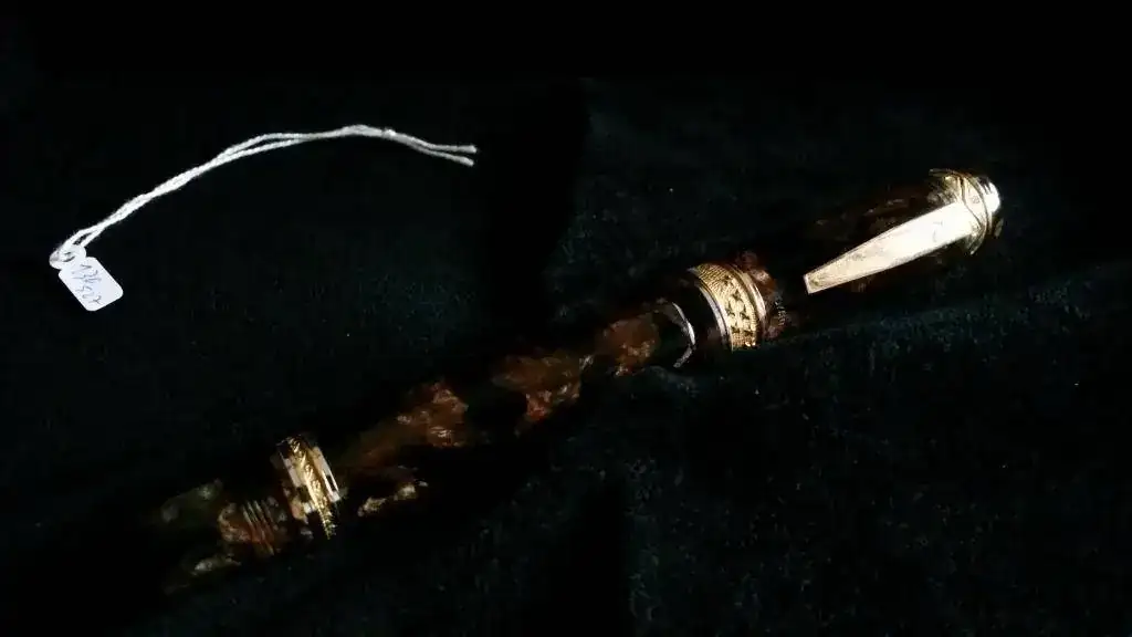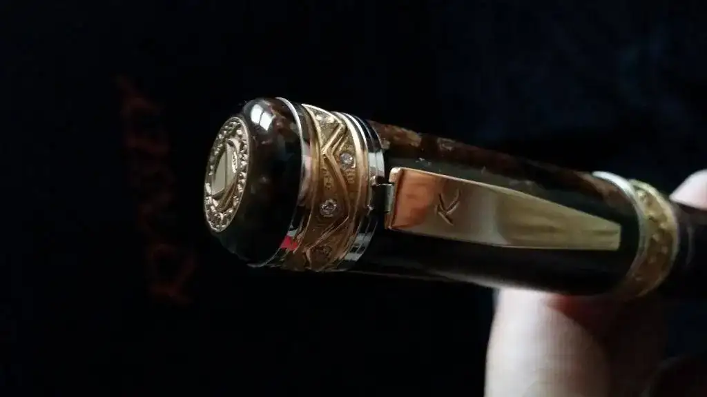 Tengo el temor (o mejor dicho la sospecha) de que Delta haya tenido algo, mucho, o todo que ver con esta pluma, ya que el celuloide, apostaría la vida, a que es exactamente el mismo que el utilizado por Delta en su Enrico Caruso y en algún modelo más. El alimentador, de ebonita, efectivamente también se parece sospechosamente a los alimentadores de ebonita de todas las Delta que poseo. Y el plumín, hasta con el orificio de respiración en forma de corazón, tiene el mismo diseño que los plumines Delta.