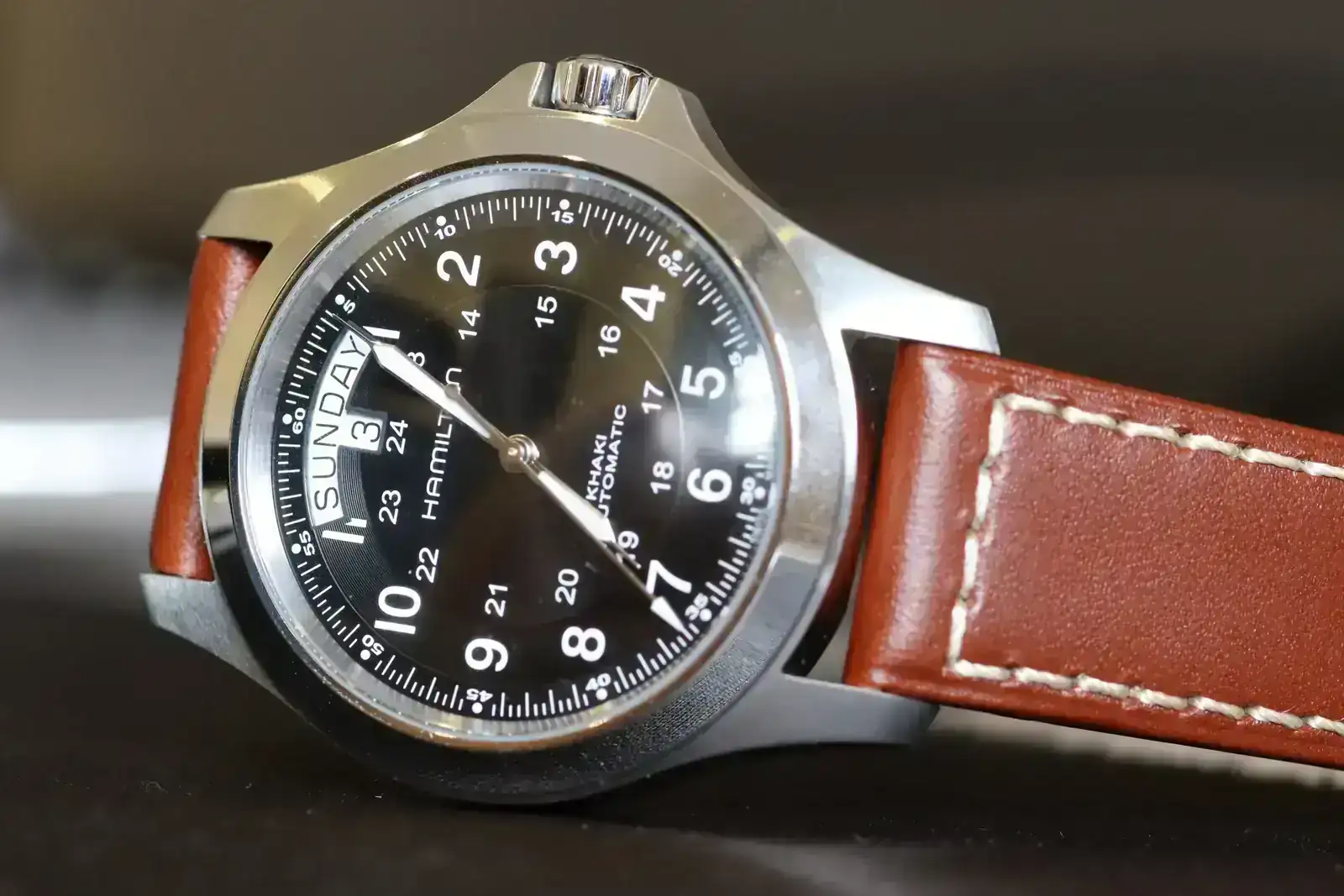 - Esfera: negra satinada con dos niveles y grandes números arábigos en blanco del 1 al 12 y, en el interior, escala de 13 a 24 horas. A las 12 se encuentra la ventana doble con indicación de día de la semana y fecha. Debajo del fechador vemos el logo de Hamilton y en la mitad inferior, "Khaki Automatic". La lectura de la esfera es perfecta, gracias al buen contraste y al material luminiscente de agujas e índices, aunque el cristal no ofrece el mejor tratamiento antirreflejos.