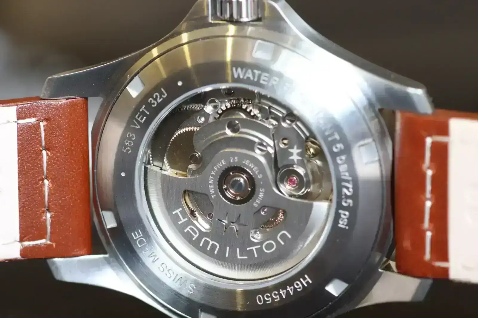 - Fondo: con cristal transparente que permite ver el movimiento automático de 25 rubíes. El rotor, de diseño sencillo, luce un acabado cepillado con el logotipo de Hamilton grabado en grande y la estrella de la marca en el centro. Una personalización discreta pero muy bien integrada, que aporta identidad sin sobrecargar el conjunto. Alrededor se pueden leer inscripciones como “Swiss Made”, “25 Jewels” y la resistencia al agua de 5 bar / 72,5 psi.