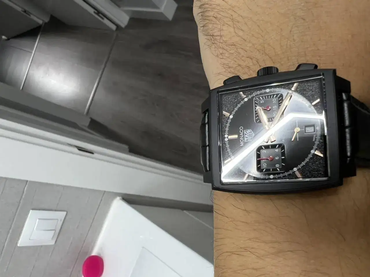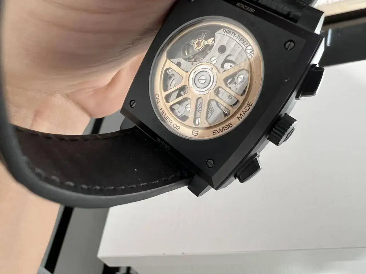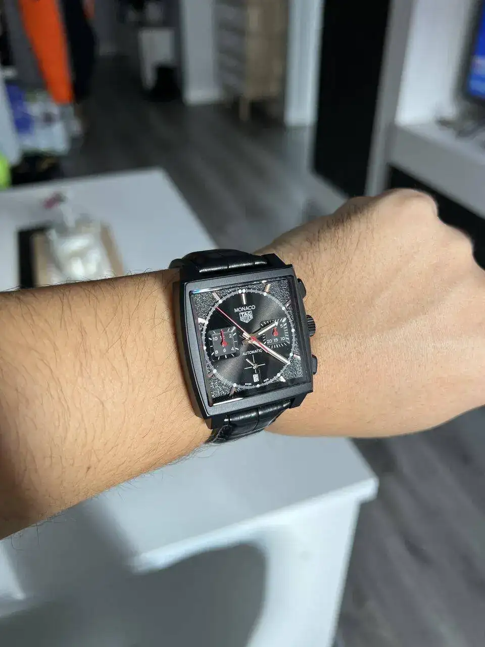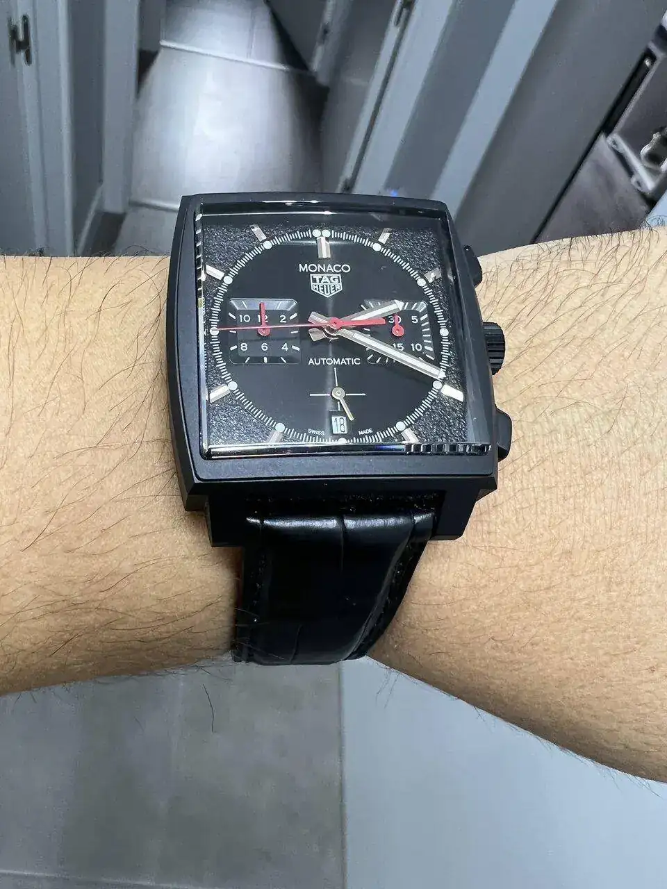 Es un 39mm de titanio grado 2 con una capa de dlc ( se hacen grande por la forma los monaco ) pero en negro parece más pequeño que el Mónaco de acero