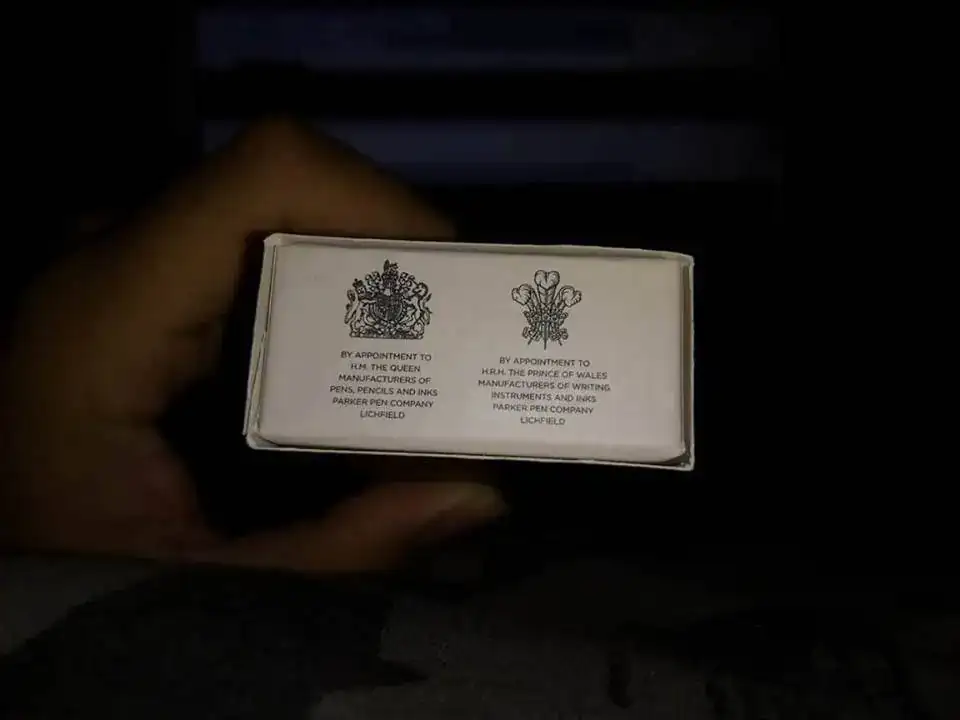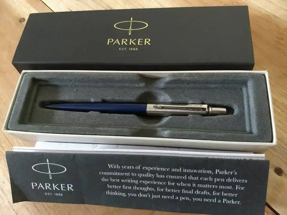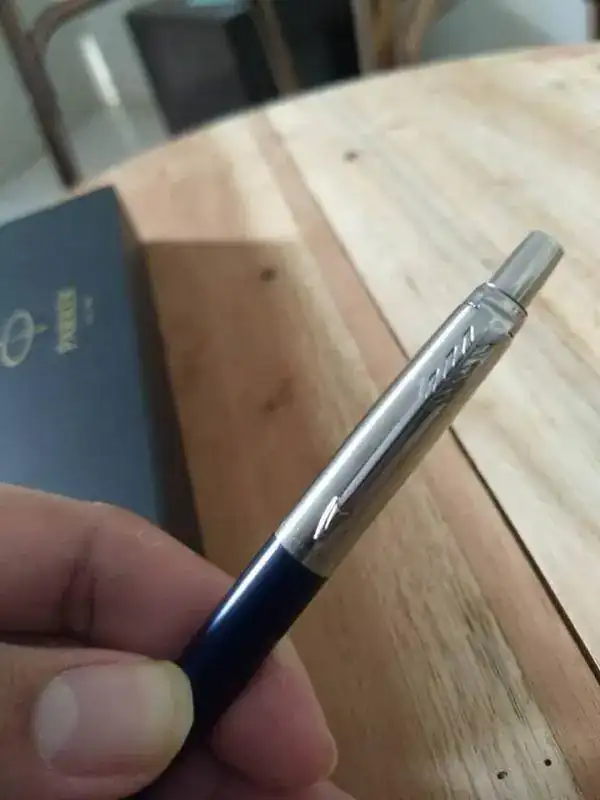 vino con un papel tipo instructivo y garantía y en la parte plateada tiene grabado (muy fino y dificil de ver) el logo de la marca y la palabra PARKER