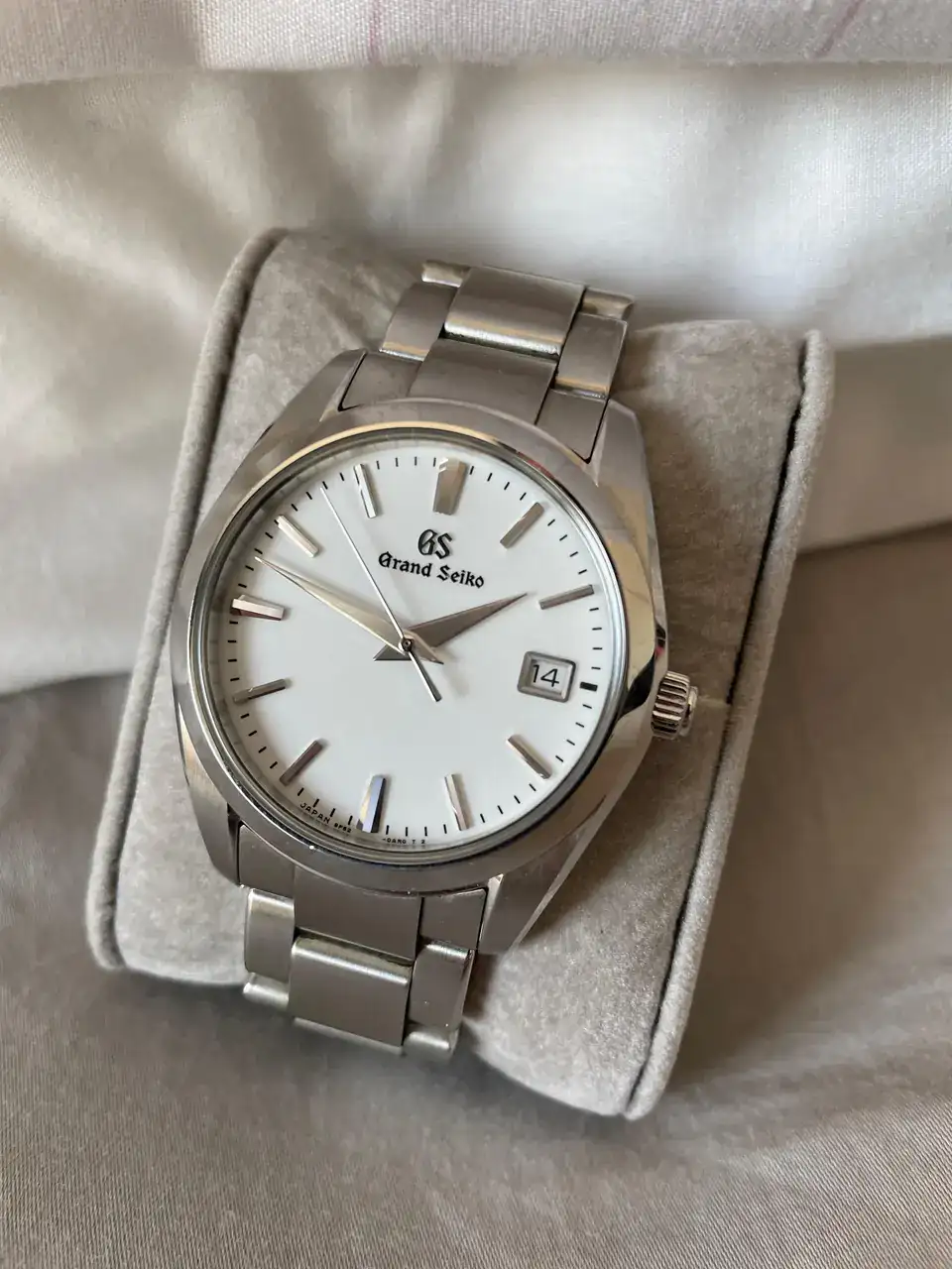 El problema es que desde el principio, me di cuenta de lo maravilloso que es este reloj. Es francamente insípido y soso en las fotos de catálogo de Grand Seiko, pero en directo es un verdadero espectáculo de luces. Tiene una esfera blanco nieve que bien podría ser porcelana, con las grafías de Grand Seiko ligeramente por debajo de la superficie (a mí me encanta esa tipografía, parece que siendo japonés no pega, pero al haber estado en Japón, me dio la impresión de que los relojes lo toman como algo mucho más clásico que aquí). En este reloj, todo está perfectamente cuidado: la segundera es increíblemente precisa, clavando cada segundo. Las agujas y los índices están trabajadas de modo que reflejan cualquier rayo de luz, y le dan una tridimensionalidad al conjunto de la que adolece la esfera tan plana.