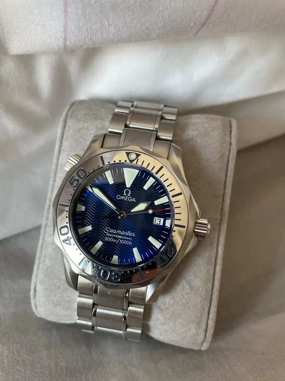 Es un Omega que no parece un Omega. No llama nada la atención, la gente seguramente lo vea feo, o por lo menos, genérico. Yo en cambio me quedo embobado mirando la esfera, ese patrón azul que a veces parece madera, y otras terciopelo, o el carril de los minutos que simula una vía férrea. La segundera le da también un toque de color, sin ser algo que salte a las retinas. Y el tamaño, aunque sea de 40mm, no se ve grande en mi muñeca.
