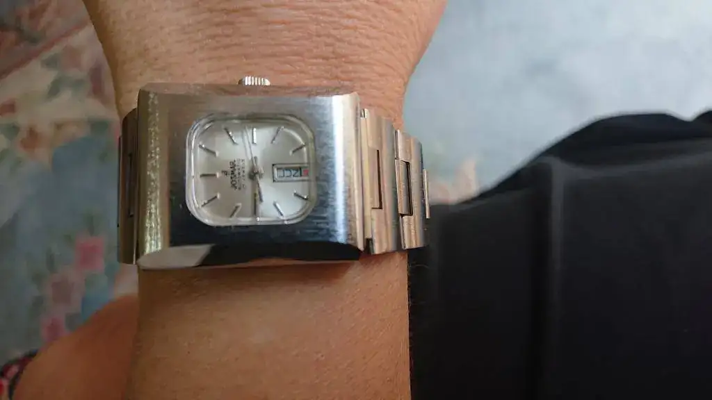 Como veis, queda bien contundente y vistoso en la muñeca. Estéticamente, me recuerda muchísimo al Seiko TV que me confió mi querida Gabi, pero girado. Un reloj ponible y lucido, en mi opinión. No sé qué calibre monta, pero a decir del tórrido sureño es sencillote y rebelde