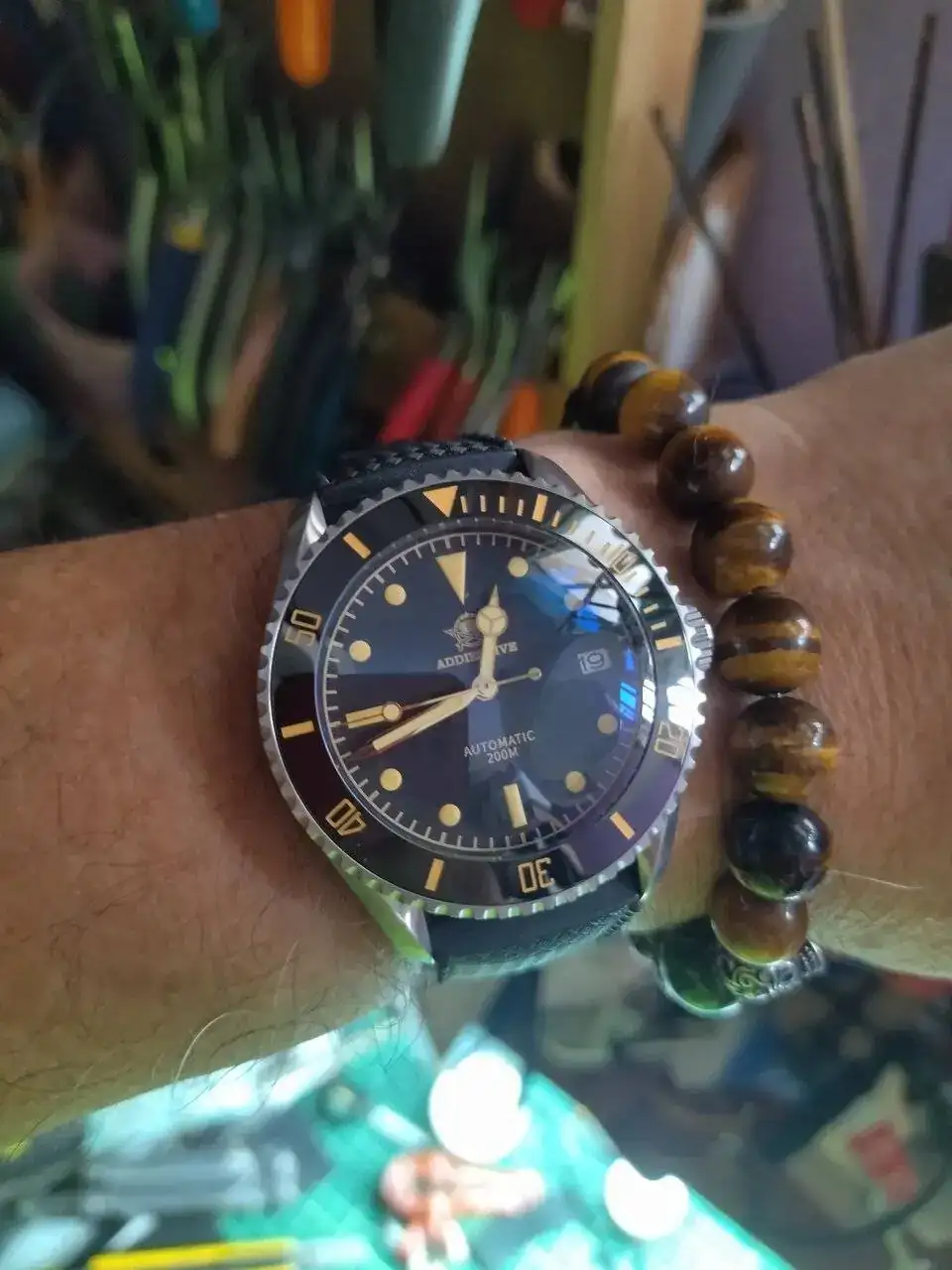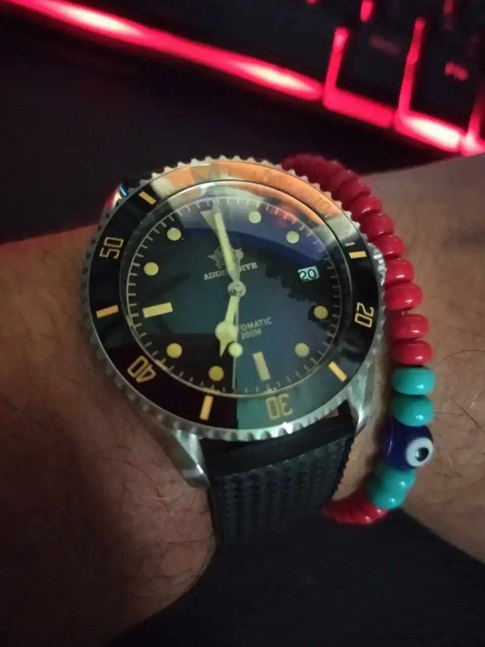Me encanta el color de los índices en combinación con el dial. Muy lindo, esa tropic es un acierto!Hoy con este recien llegado, me encapriche con las manecillas mercedes, (cosas de la edad), tuve un Cadisen en la mira, tambien un Pagani, pero me salto una oferta sumamente tentadora por este y por menos de USD 50, se vino a casa.