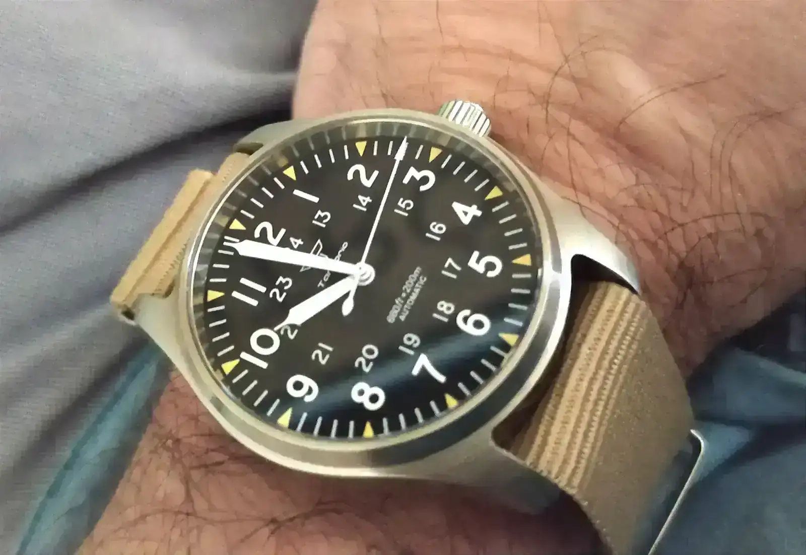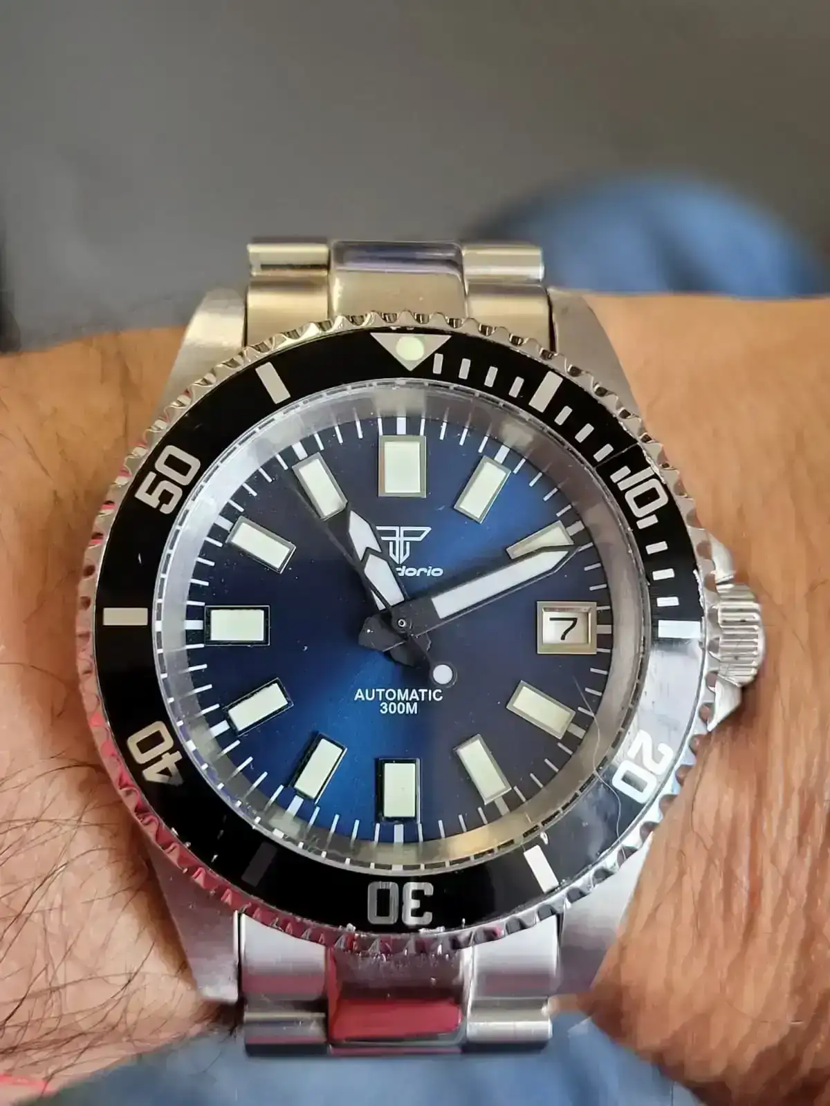 Yo tengo uno similar en 36mm con el dial esteril, el tuyo es de 39 y en titanio ?