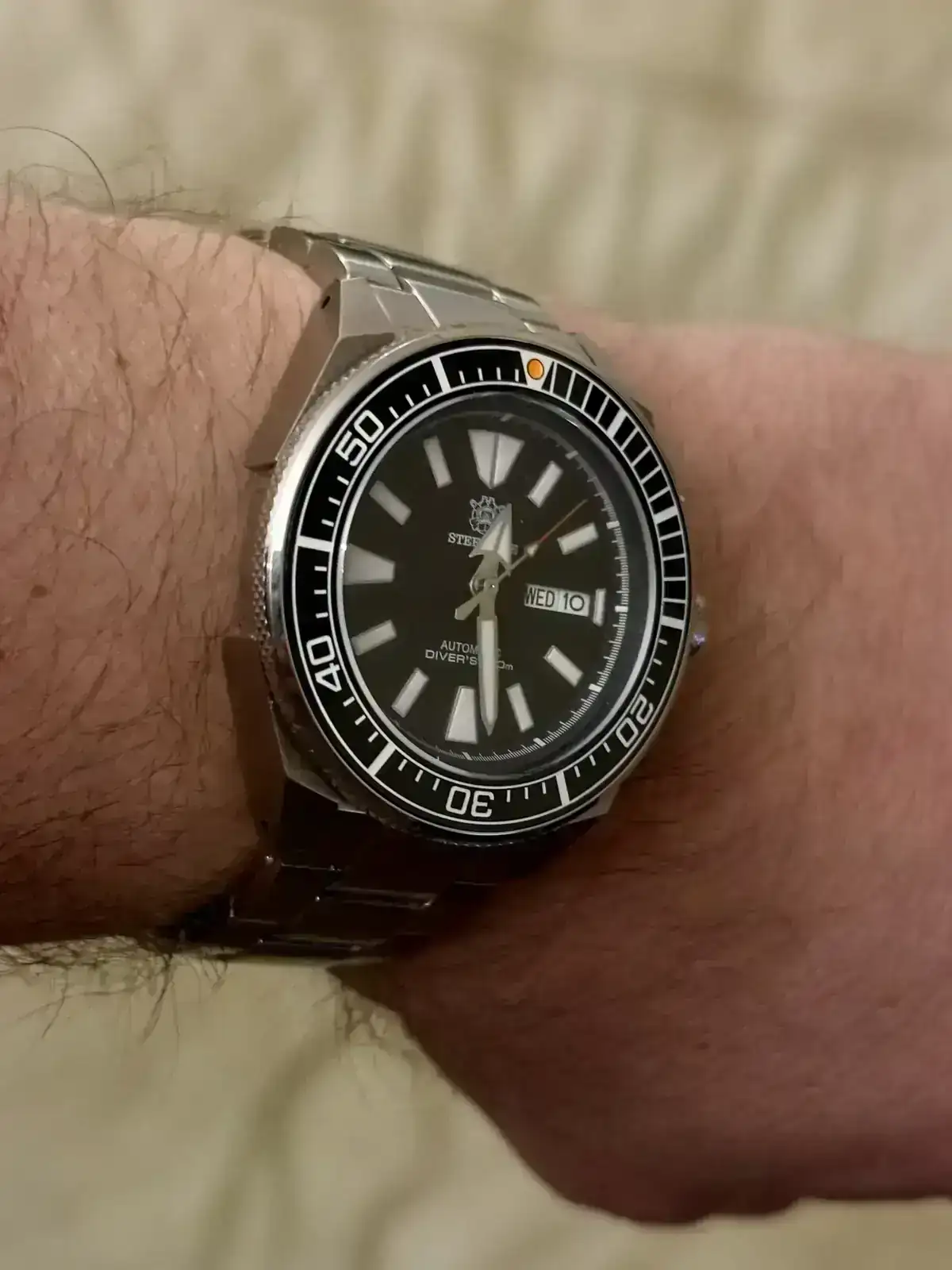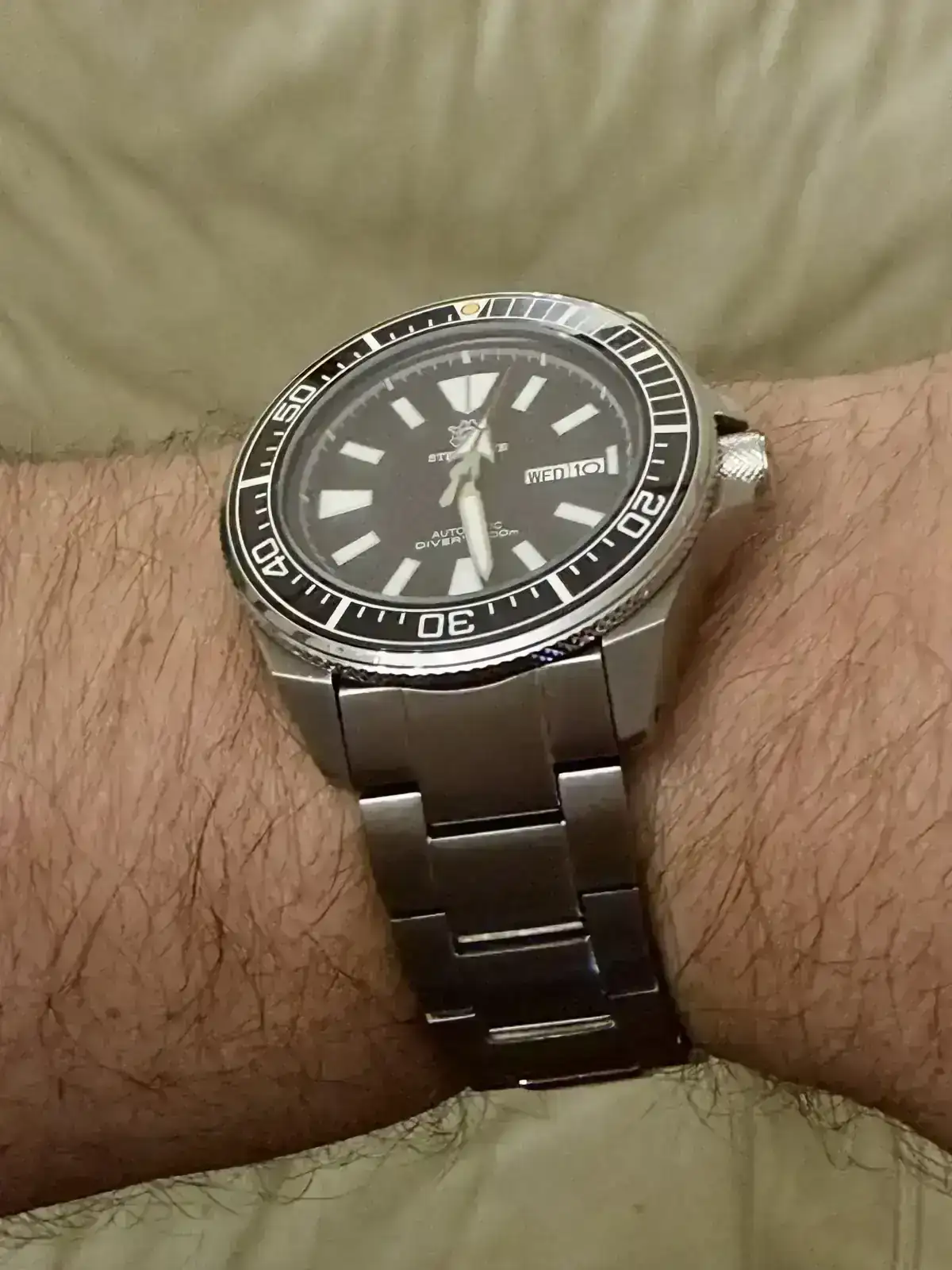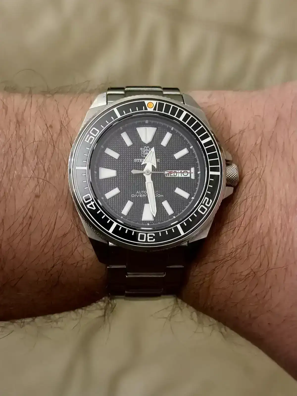 Pues mejora muchísimo con ese armis.Por fin y después de 4 meses de comprar el reloj me han mandado el armis. Yo lo compré con armis, pero después de pagar el de Steeldive me dijo que no tenía con correa y que me lo mandaría con caucho y que luego ya me mandaría la correa de acero…