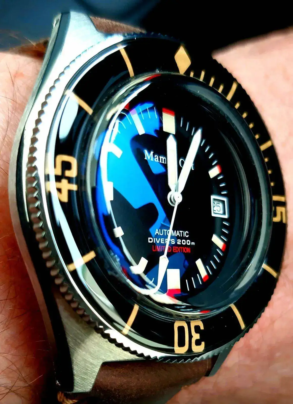 El reloj es una preciosidad con caja de inox, corona roscada, zafiro, nh35, un lumen formidable y un brazalete estupendo que no uso porque prefiero una correa de cuero.