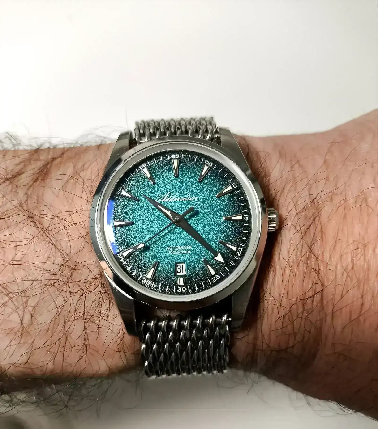 Precioso, y ese brazalete le queda de lujoPues hoy estreno este acabo de llegar a casa y ahí estaba esperándome, he cacharreado un poco con el y el brazalete que traía era una mierda, así que le he puesto esta shark mesh y no puedo estar más satisfecho con el resultado además viene según el timegrapher muy bien ajustado +-2segundos día!