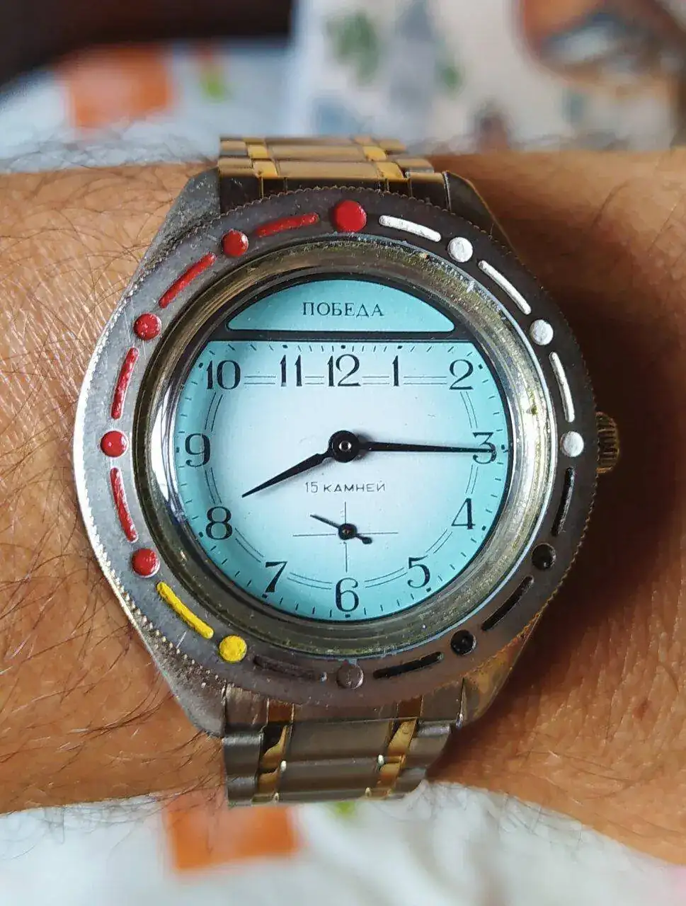 El movimiento y dial es pobeda de cuerda manual, la caja es china y el bisel es vostok amphibia; así o más franken al mejor estilo Sovietico que pretendía compatibilidad de piezas para que cualquier relojero pudiera reparar jijijijiMe da que el corazón mecánico, es chino. Pero que nos describa, por favor, el compañero @Josuegomez su asiático. 😉👌 Gracias!