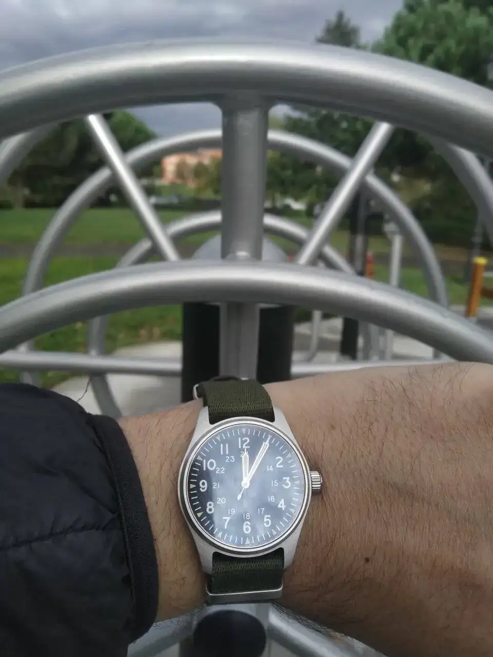 Muy bonito, me gusta esa nato, con ese color verde oscuro, ¿ Se puede saber de donde sale?Tandorio por el parque, viendo las máquinas de deporte públicas que andan por allí