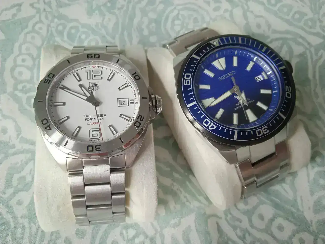Los relojes de diario, que voy alternando cada X tiempo, son el TAG HEUER F1 con el que me di un autohomenaje y el Seiko Samurai que me regaló mi mujer por mi cumpleaños pasado. El TH es mi grial, mi reloj favorito, el que más me gusta ponerme y con el que más me identifico, es obvio que estoy encantado con él y nunca saldrá. El Samurai me encanta, su azul es hipnótico, y no tiene nada que envidiar en calidad a ningún reloj de ese segmento de precios, incluso de segmentos superiores, que yo conozca.