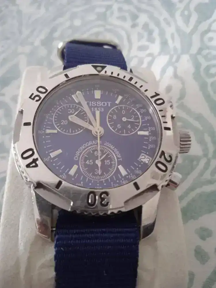 También tengo éste cuarzo Tissot PRS 200 Chrono que fue mi único reloj durante años y que, cuando llegué al foro buscando info sobre el Omega en 2012, fue quedando relegado. Actualmente es el reloj que menos utilizo y, siendo muy frío, podría salir pero he compartido mucho bueno con él y para lo que me podrían dar creo que no merece la pena dejarlo ir. Me parece bonito y aunque sea unas cuantas veces al año le busco su momento. Le he puesto esa nato porque su brazalete tiene problemas.