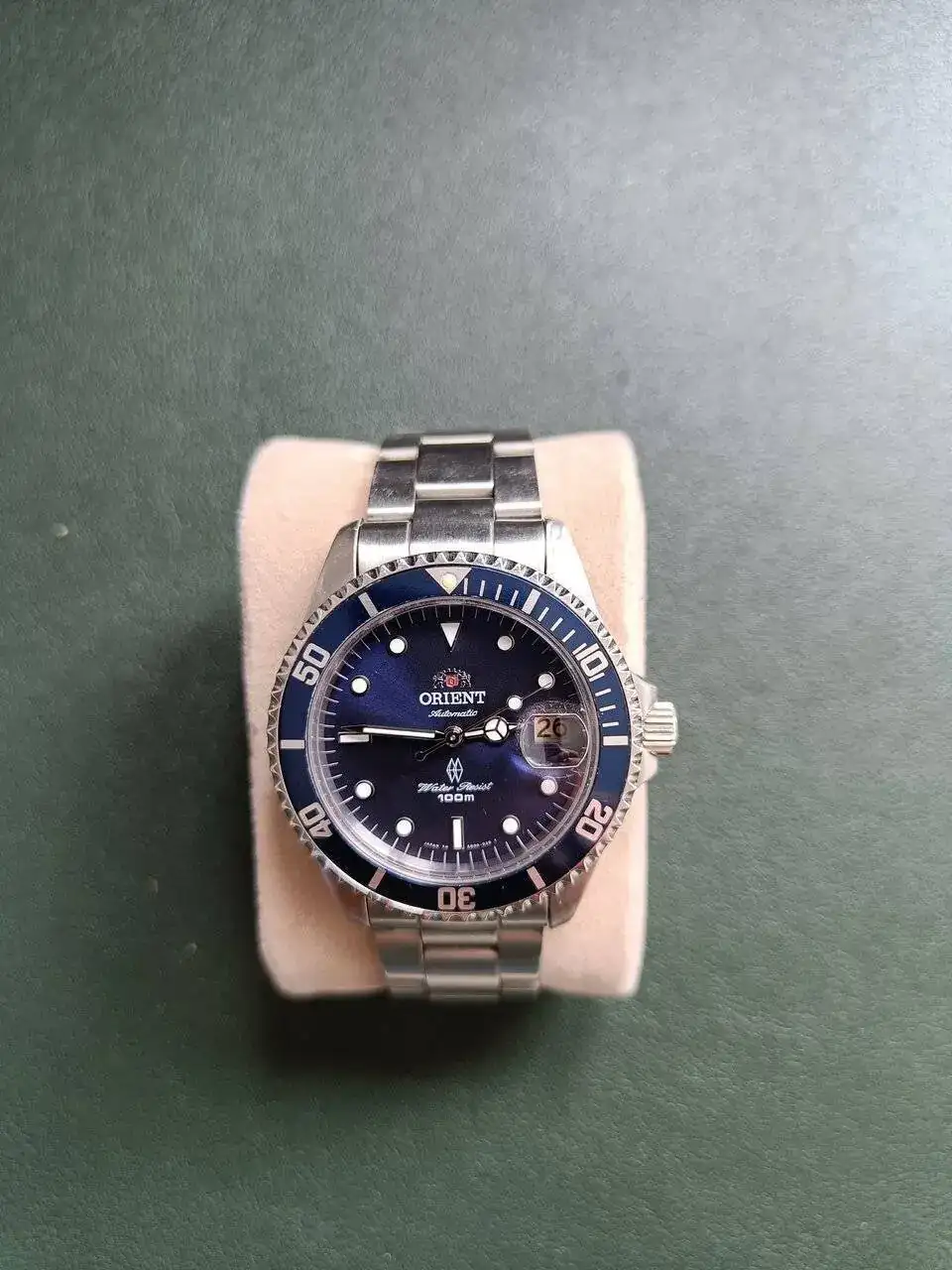 El tercero en llegar fue un reloj al que le tengo mucho cariño. Cuando era pequeño mi padre era amigo de un relojero que tenía expuesto un Orient dentro de una ostra dentro de una urna de agua que cuando se abría dejaba ver el reloj. Siempre que acompañaba a mi padre, mientras él charlaba con su amigo yo me quedaba hipnotizado con el reloj. Por eso busqué ese reloj o lo más parecido a mi recuerdo.