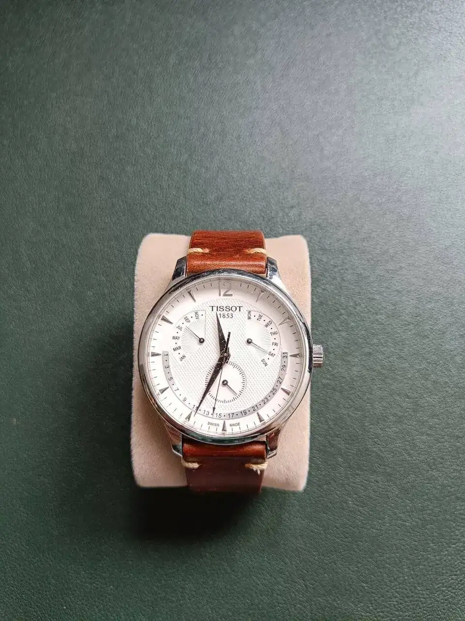 El siguiente en llegar fue un Tissot perpetual calendar, empecé a trabajar en una oficina y necesitaba un reloj de vestir. Me gustan los relojes grandes, por lo que cuando tuve que decidir entre un Tissot Visodate y el perpetual me decidí por el perpetual, alguna vez me he arrepentido, pero soy de los que siempre pienso que la otra opción era mejor, eso pasa cuando no puedes llevarte las 2 a casa😄.