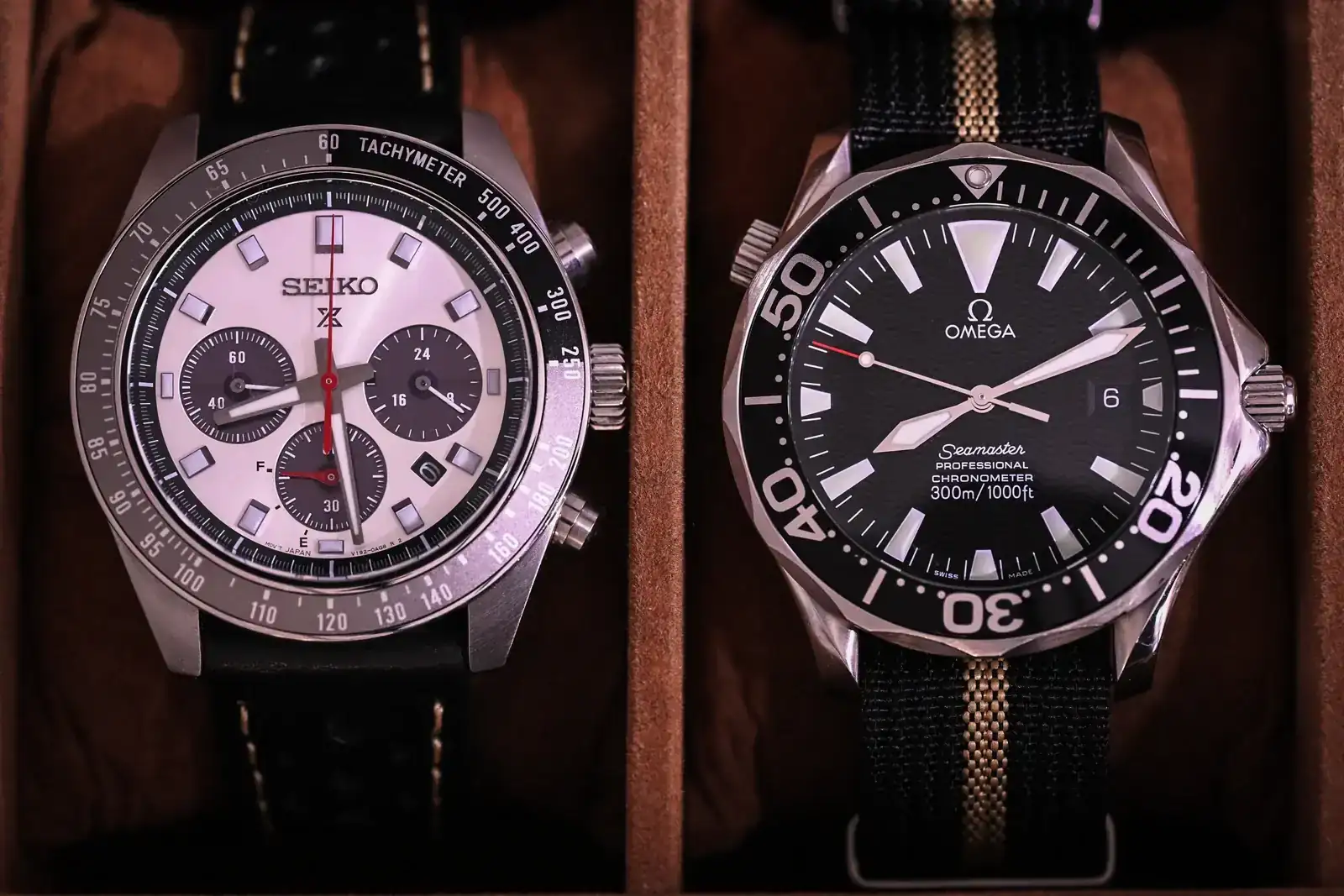 Luego llegaron los dos grandullones de la caja. Otro Seiko, esta vez el Speedtimer de cuarzo solar (y que fue el reloj que llevaba el día que nació mi hijo), lo despojé de su brazalete el primer día de uso, y le coloqué una correa de tipo rally. Después compré el Omega Seamaster 300 2254, un clásico. Muy grandote para mi muñeca de escasos 16 cm, pero es un reloj que me encanta. Su brazalete con enlaces finales macho no ayuda a disimular su tamaño, por eso lo llevo con una NATO de WatchGecko. Quizás me haga con un brazalete de Uncle Straps, que tiene los enlaces finales hembra, tengo que pensarlo.